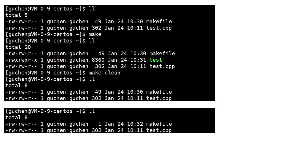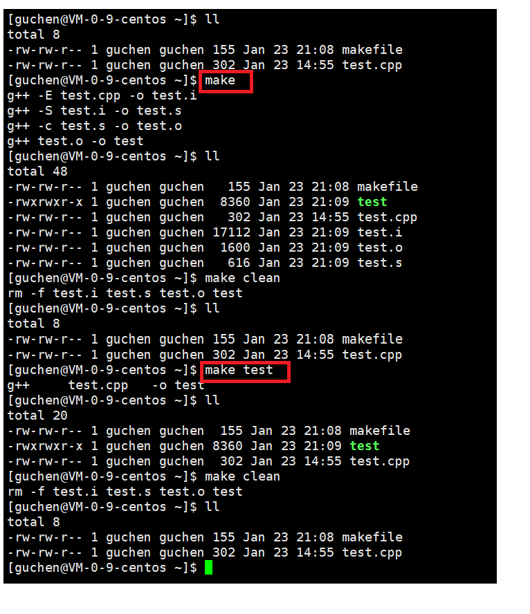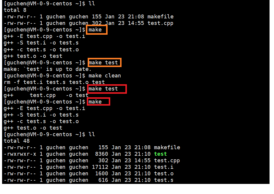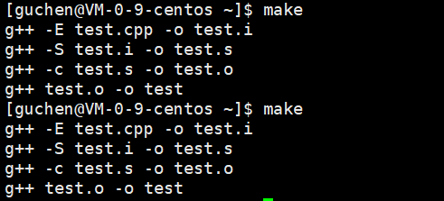 但是make test执行后,make还可以执行,因为make要生成的过程文件.i, .s, .o都不存在;如果make执行后,make test就不能执行了,因为make test要生成的test已经存在了,而且test.cpp没更新,不需要编译
