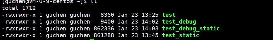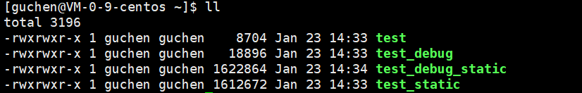 gcc test.c -o test_debug -g默认是release,加-g选项是debug,debug模式程序可以被追踪调试,添加了debug信息,我们看到debug比release模式得到的可执行程序体积大一些