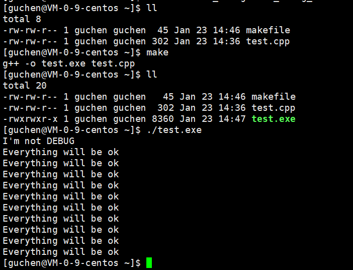 因为makefile第一个目标文件是test,所以make默认执行的是test,但是和make test执行的结果不尽相同,make test直接把详细步骤合并,一步到位,只生成目标文件test