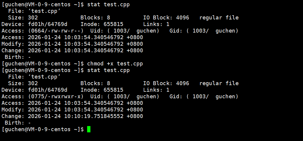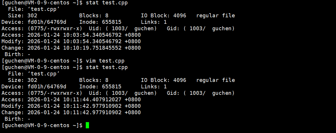 stat 文件名,可以查看文件被access(访问)、modify(修改内容)、change(修改文件属性)的时间