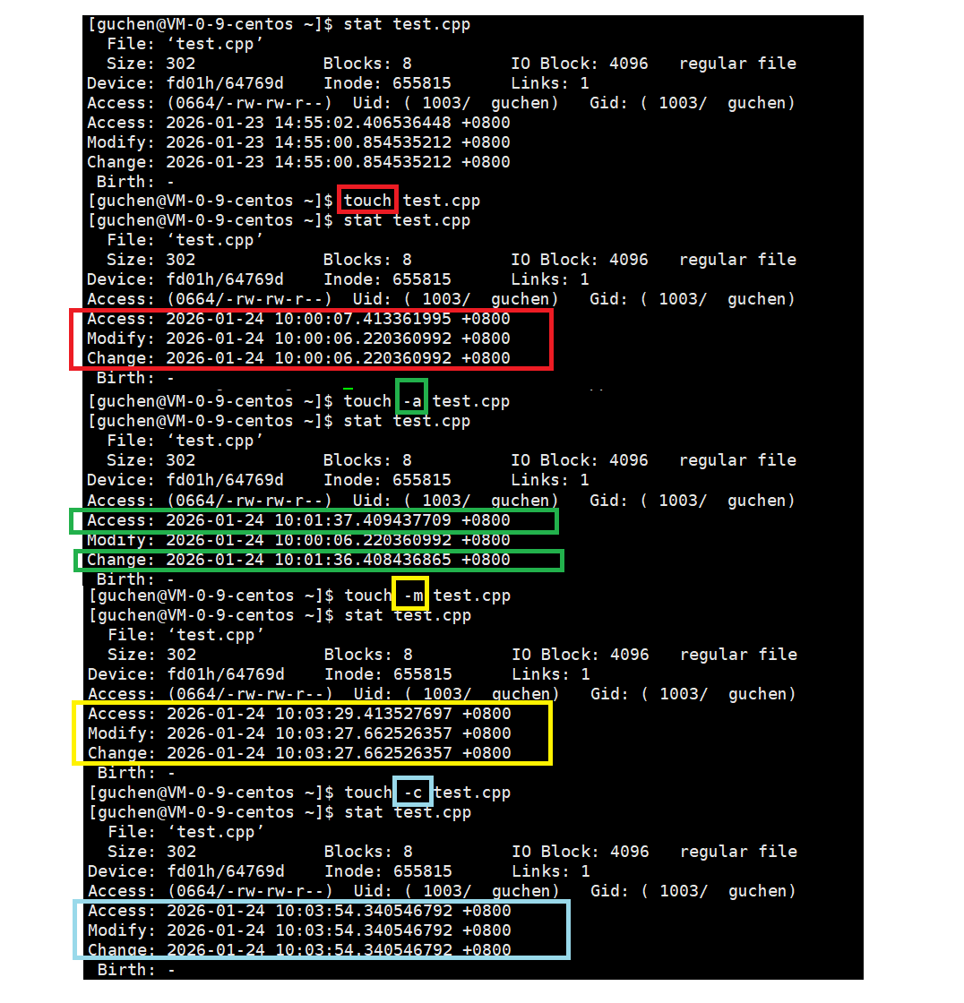 也可以手动更改文件amc的时间,touch 已存在文件名可以做到,并且加选项-a/-m/-c可以更改文件a或m或c的时间