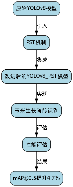 YOLOv8_PST模型是在YOLOv8基础上改进的目标检测与分类模型,特别针对玉米生长阶段识别任务进行了优化。模型主要包含三个核心组件:Backbone、Neck和Head。