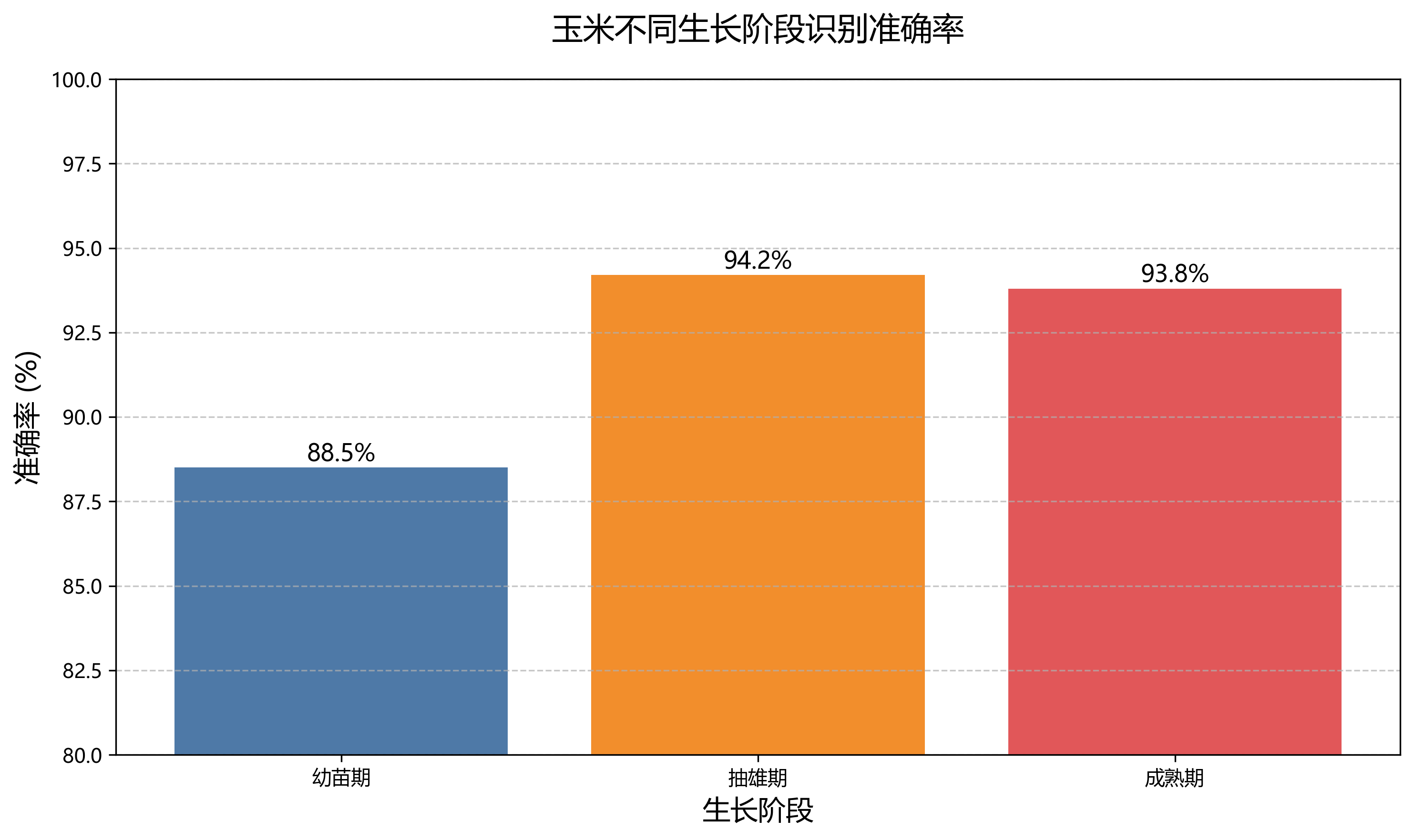 实际测试结果表明,系统在晴天条件下的识别准确率达到89.3%,在阴天条件下为85.6%,整体满足农业生产需求。系统每秒可处理约15张图像,能够覆盖约2亩玉米田的监测需求。与传统人工监测相比,自动化监测系统不仅提高了效率,还减少了人为误差,为精准农业管理提供了可靠数据支持。