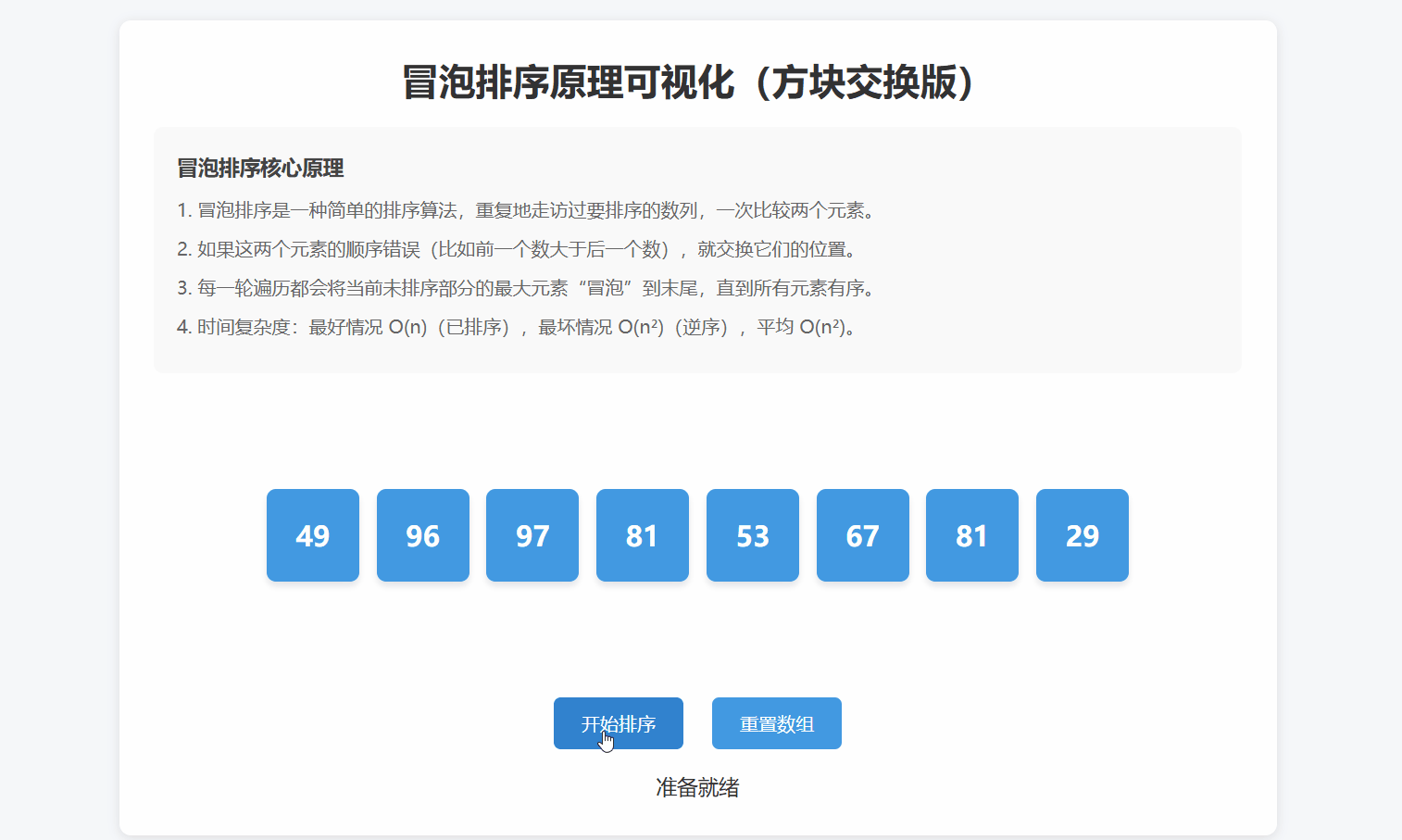 排序是把数组元素按指定顺序(升序 / 降序)排列,冒泡排序 是新手必学的基础排序算法,核心是 "相邻元素比较交换,大的元素逐步往后移,像气泡上浮一样"。