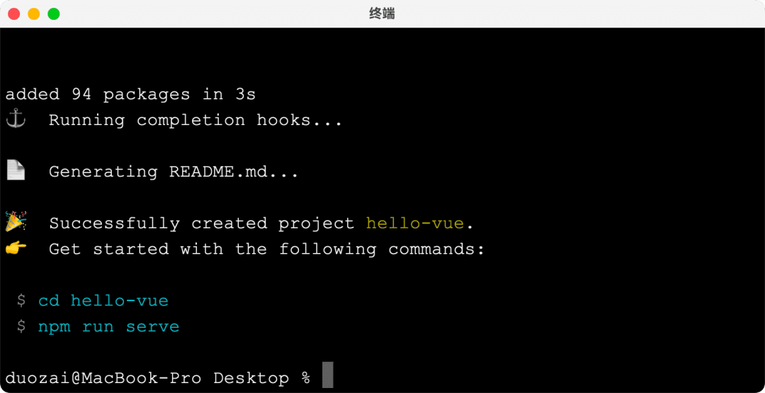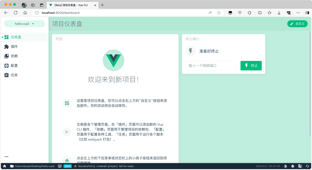 @vue/cli 安装完成后,可以使用命令行创建一个 Vue 脚手架项目。