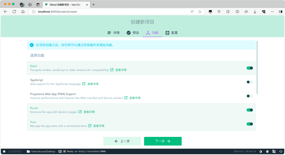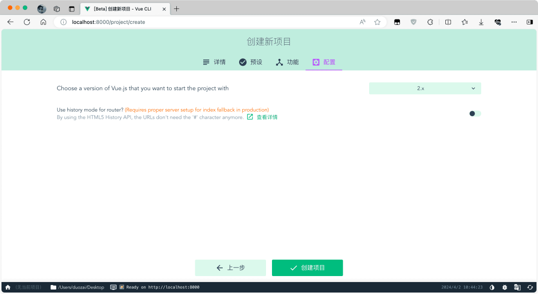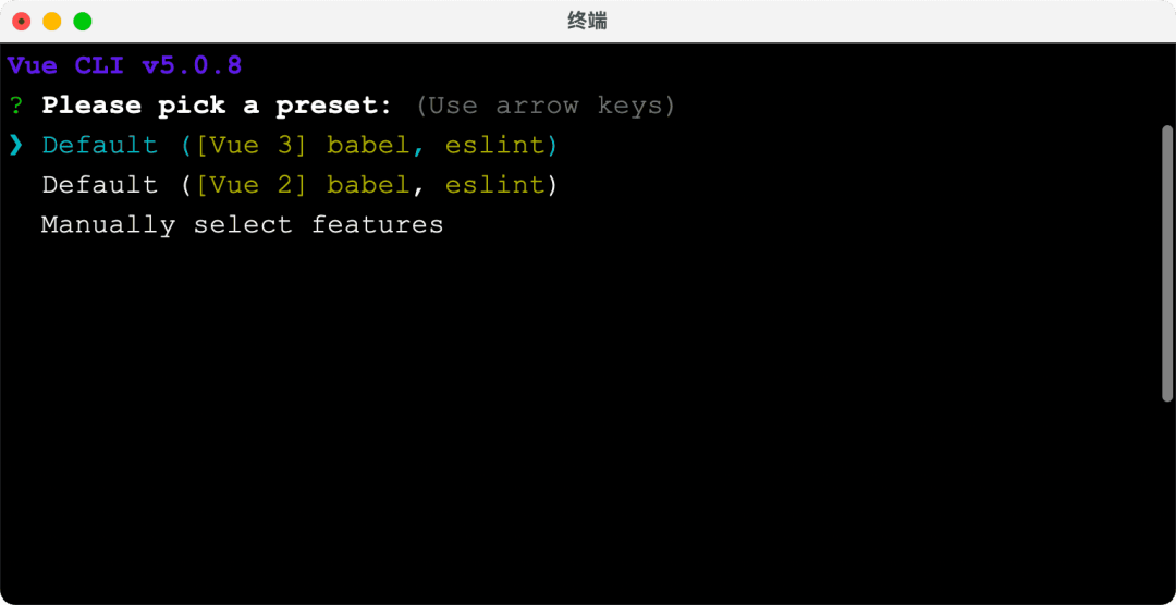 选择 Vue 脚手架项目的预设配置: