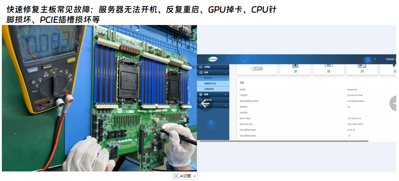 以实际案例为例,针对超微X13DEG-OAD主板反复重启、GPU掉卡等疑难杂症,以及超微服务器3000W电源模块短路故障,捷智算GPU维修中心均能快速响应并修复。这得益于其完善的配件库存动态管控系统,实时同步核心配件库存,智能补货预警确保了维修的及时性。