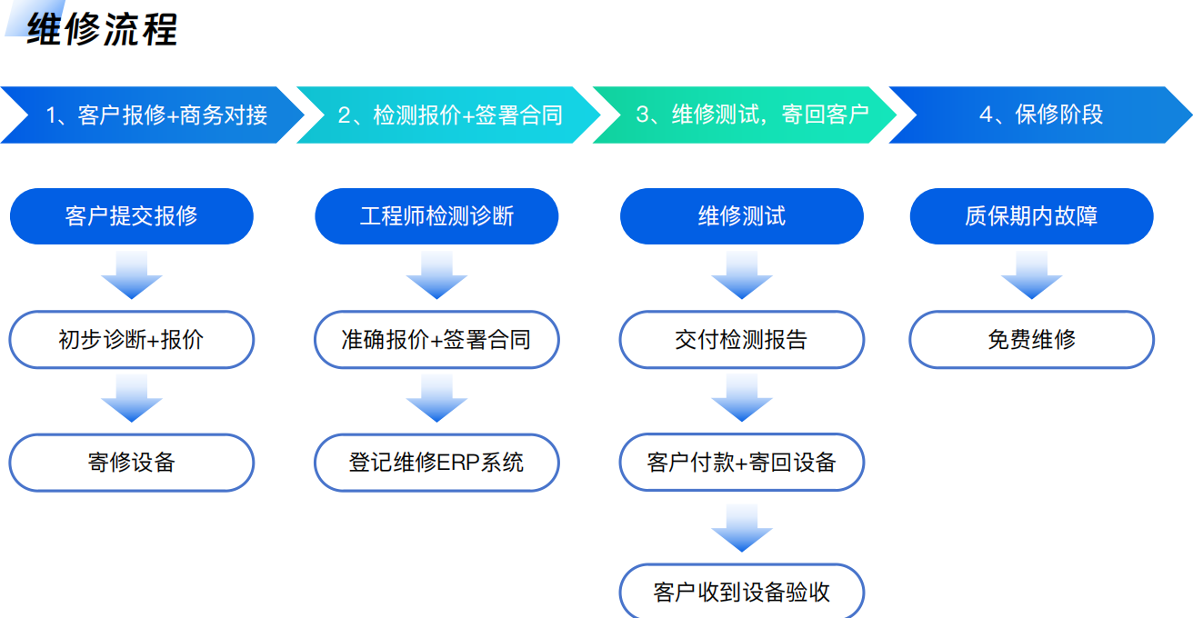 此外,中心构建了严谨的维修流程SOP:从客户报修、商务对接,到工程师检测诊断、签署合同,再到维修测试、交付报告,最后进入质保阶段,每一步都清晰透明,责任可溯源。