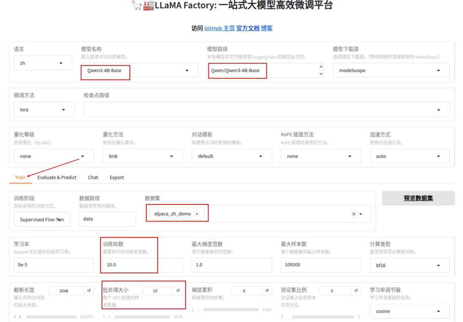 这里选择了10轮,batchsize=10,模型保存到"saves/Qwen3-4B-Base/lora/train***"路径下