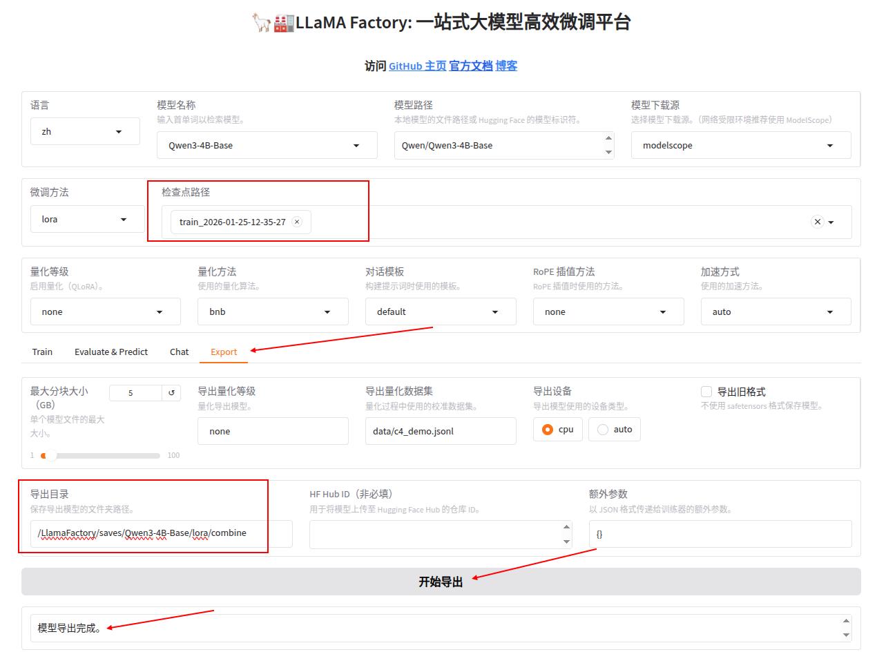 如图,点击选择Export,选择保存的lora模型的路径,要手动输入导出目录,点击开始导出,就把基座模型和lora模型融合导出了。如果想要量化,则把最上面的模型路径替换为融合后的模型路径,重新到处一份量化模型。