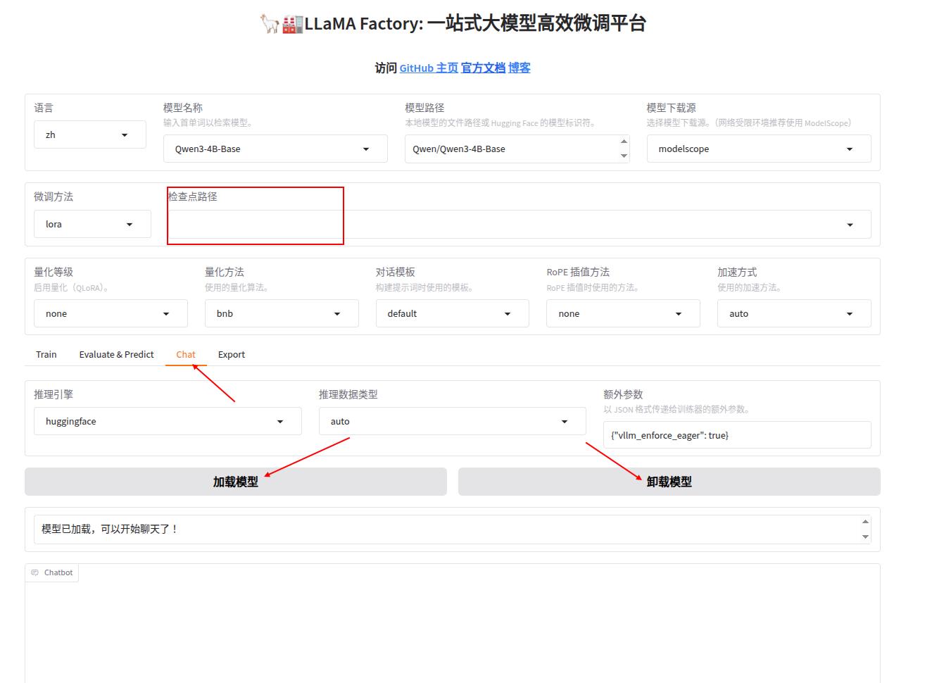 页面支持聊天,选择Chat,点击加载模型,如果切换模型更改模型的话,需要先卸载模型,如果有量化模型的话,可以在检查点路径里面进行添加。