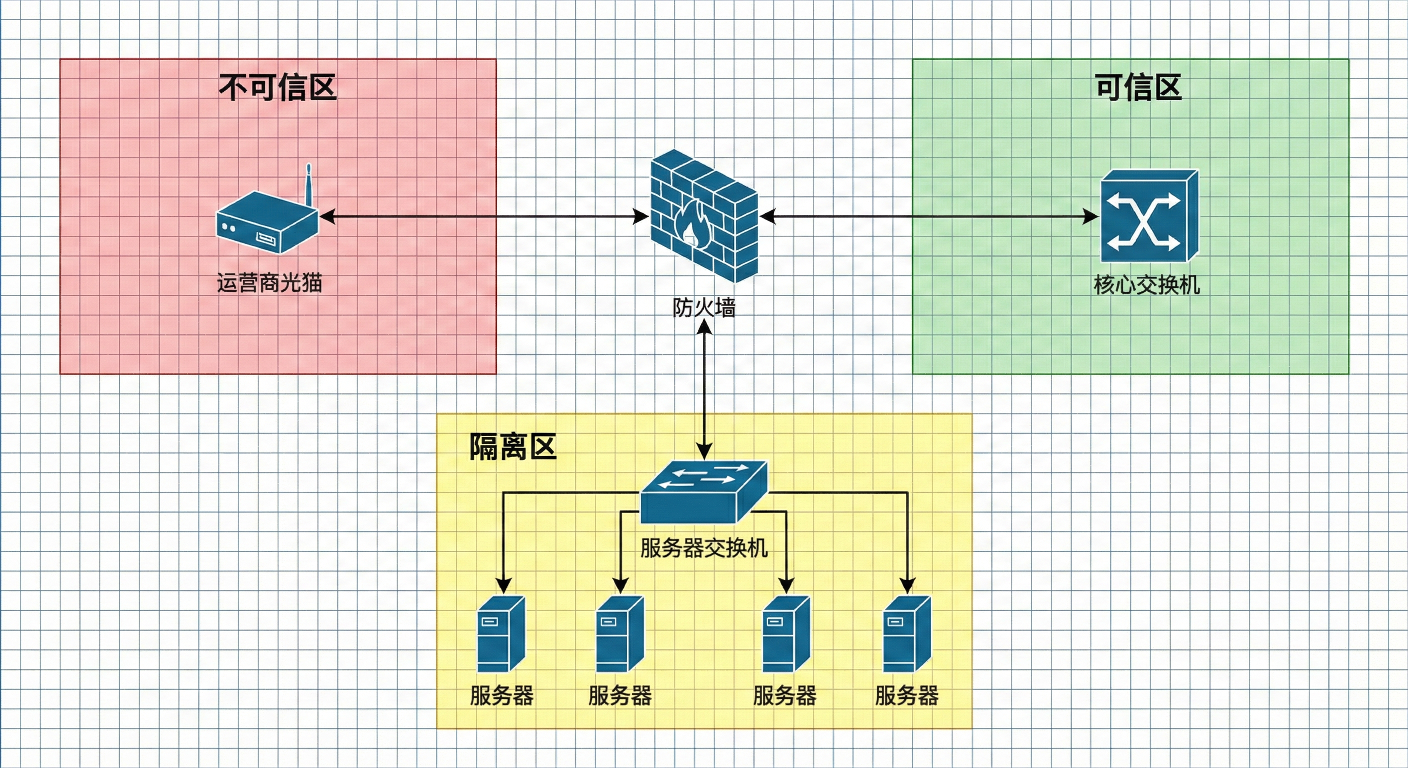 硬件防火墙接口默认是二层透明模式(适合桥接场景),需要手动切换为三层路由模式才能配置IP;安全区域是逻辑分组,同一区域内的接口默认允许所有流量,不同区域之间默认拒绝。