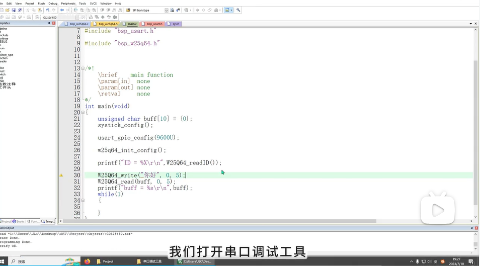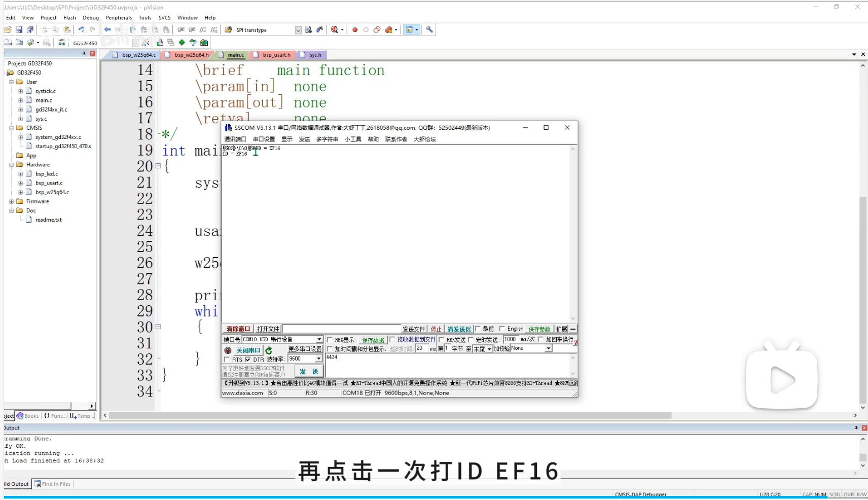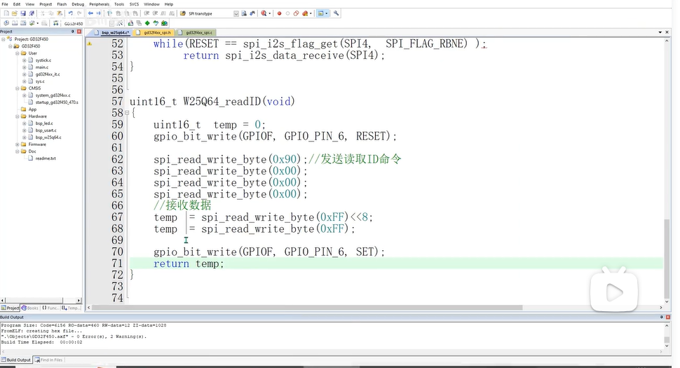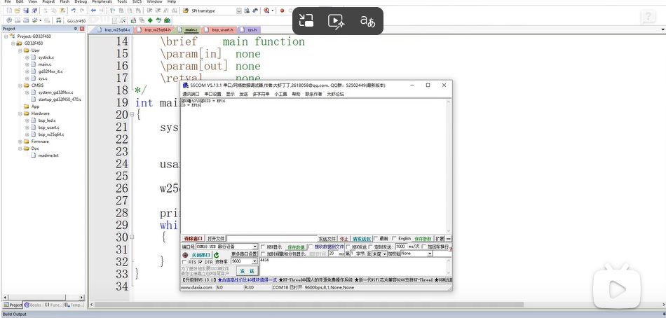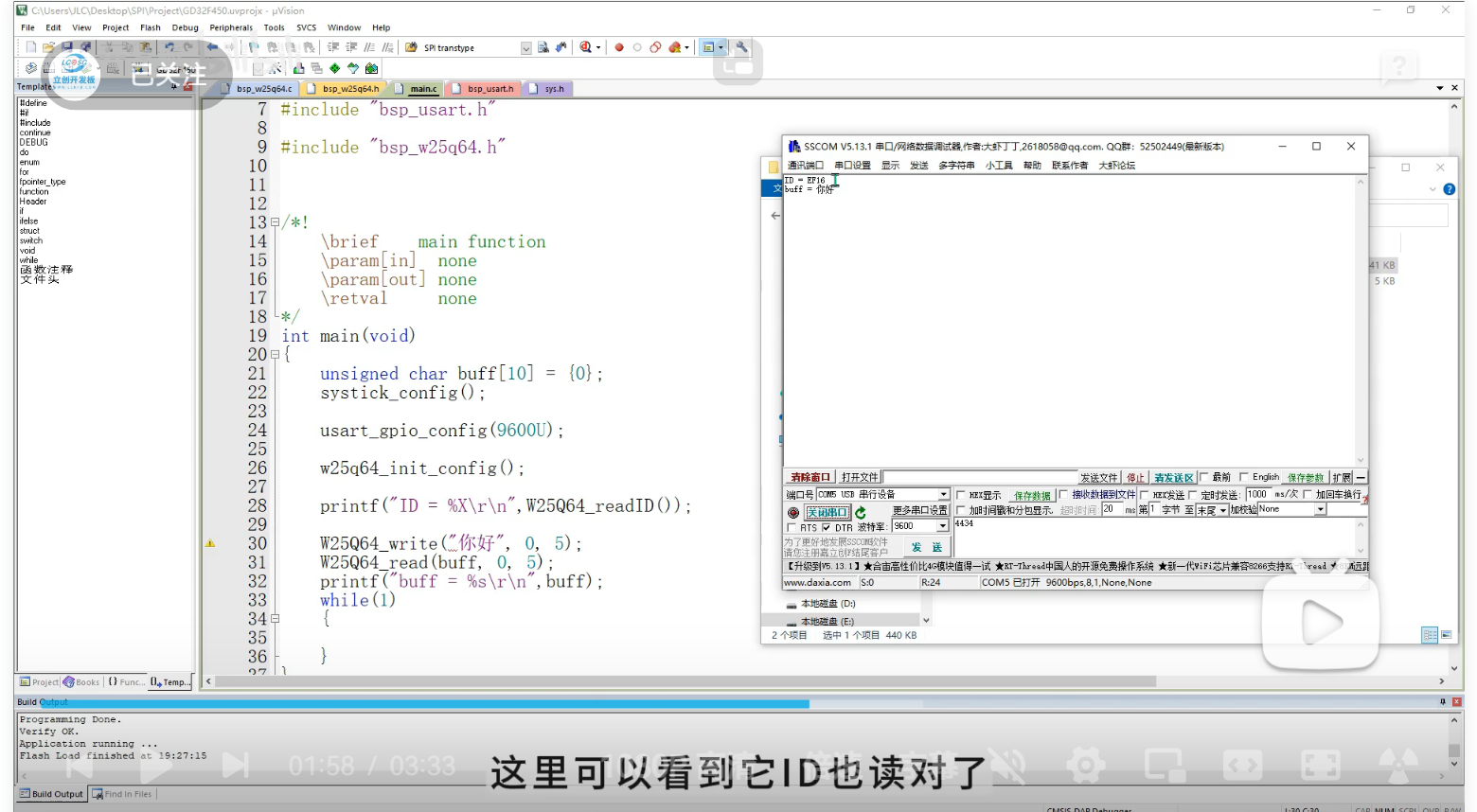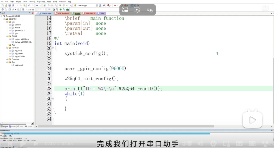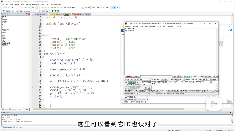 Flash_ReadID,并通过串口打印读出的三个字节。对比 Flash 数据手册中的 ID,如果一致,则 SPI 通信成功! -