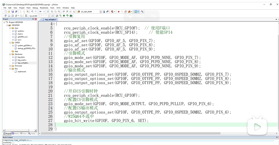 连接: 将 GD32F470作为主设备,与一个 SPI Flash 芯片(如 W25Q64)连接。