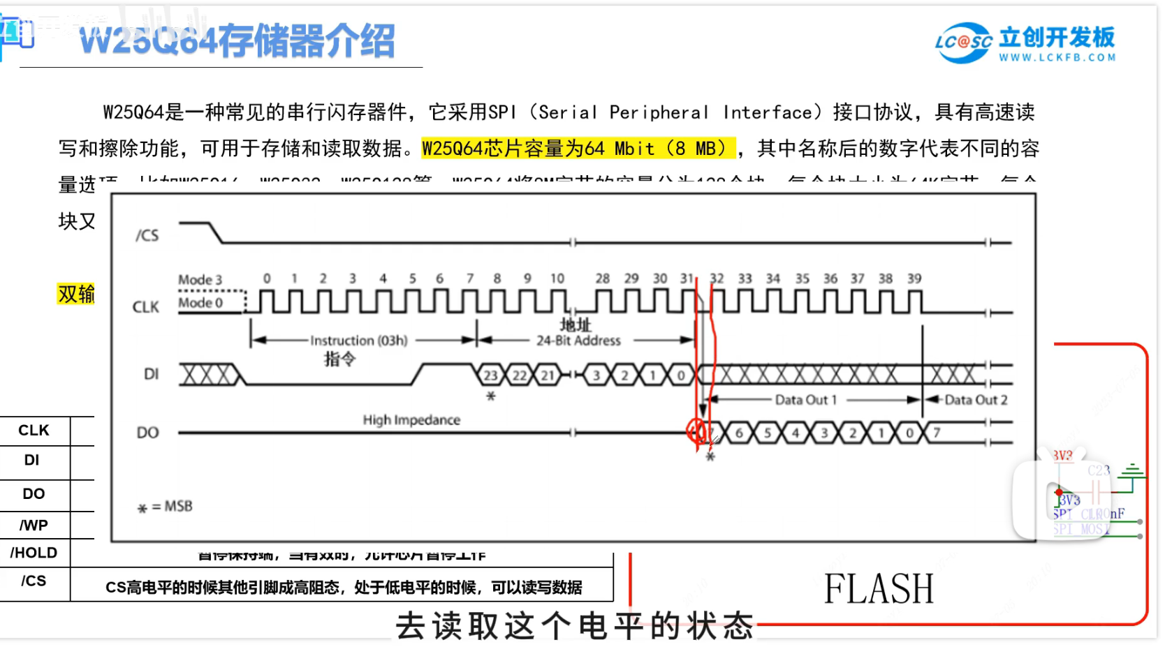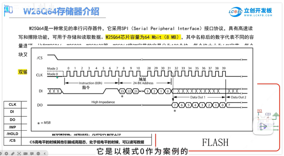 W25Q64以模式0(相位和极性都为0)作为案例,极性0:空闲为低电平,相位0:上升沿采样,下降沿移出。DI是接收所以上升沿采样,DO是发送所以下降沿移出数据。