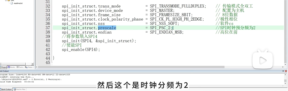 采用全双工主机模式,数据帧为8位,采用SPI模式3,SPI时钟预分频为2:根据从设备的时钟频率来确定,只要不超过其最高的SPI频率就可以;通过手册查看SPI的时钟来源。