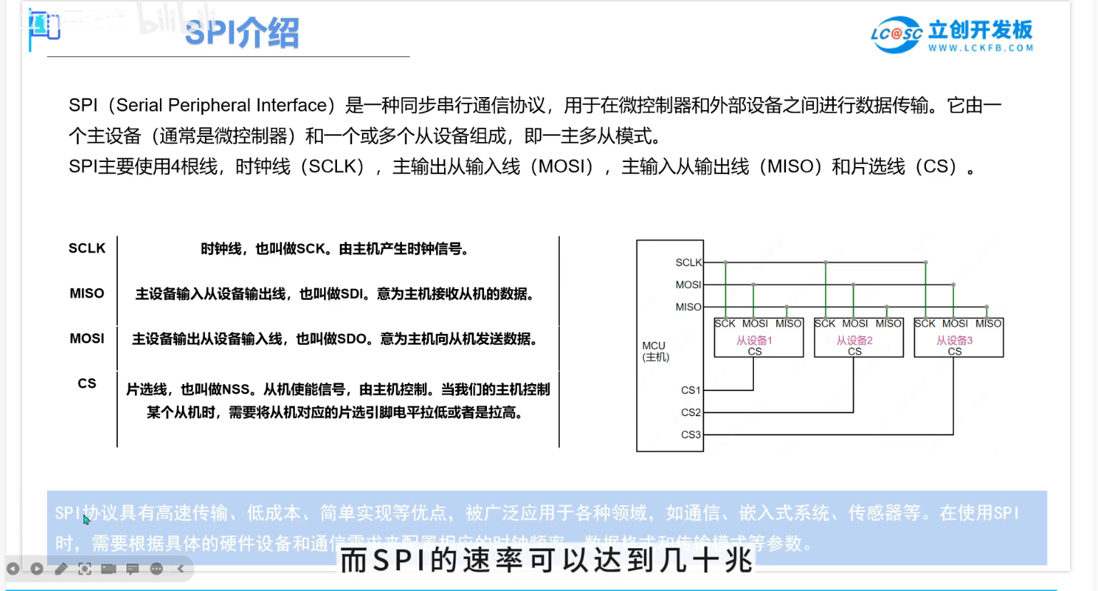高速: 速度远高于 I2C 和 UART,通常可达几十 MHz。