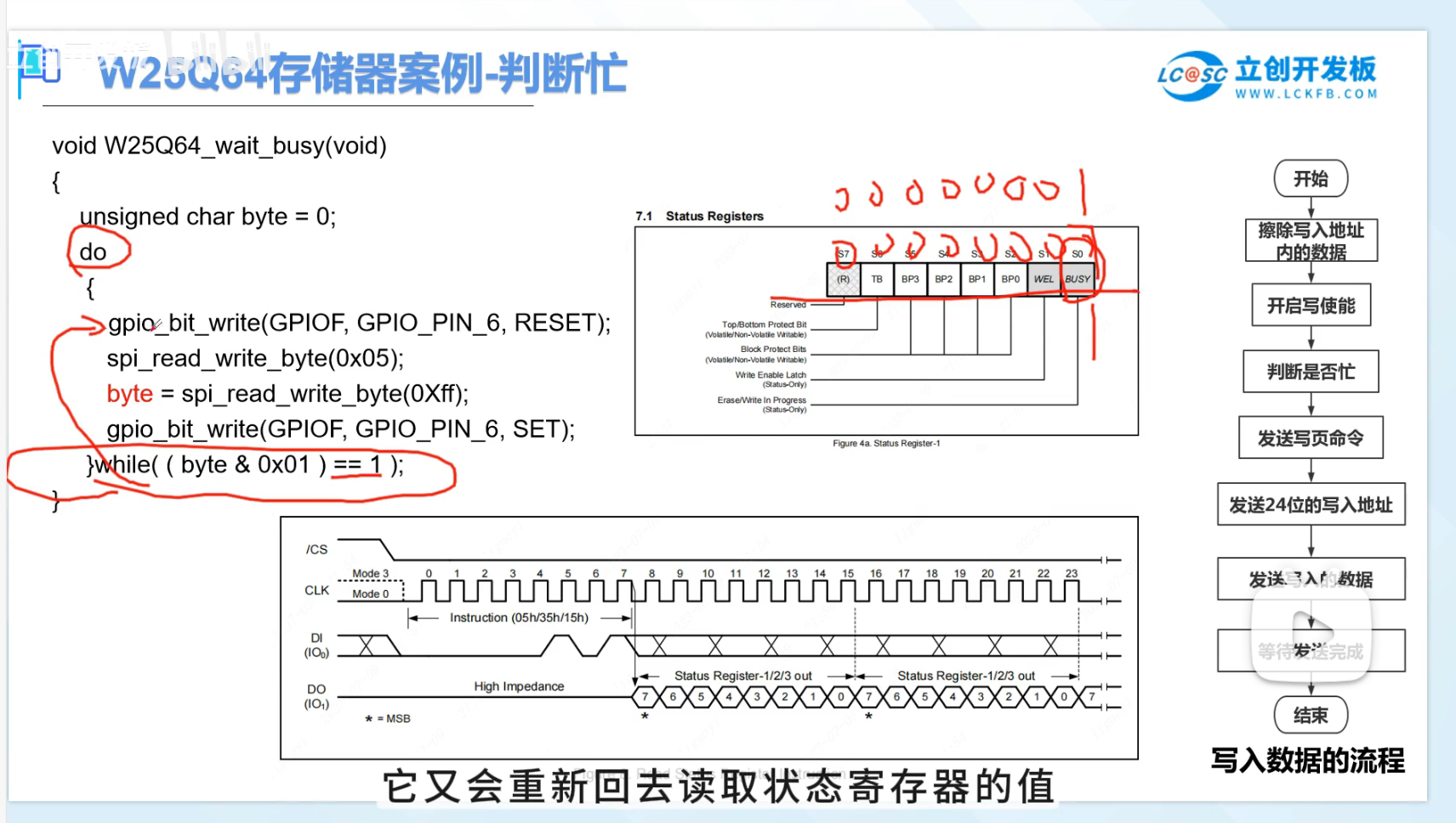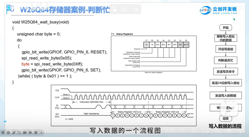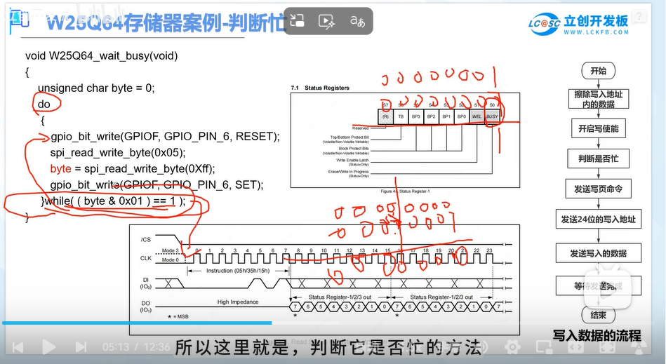 通过查看手册可以发现通过读取状态寄存器1的S0位可以查看BUSY,为1时表示正在忙,为0不忙,通过时序读取,发送数据之前要将CS端拉低,读取状态寄存器1通过SPI总线发送0X05,之后就能读取数据了,但是时钟是由主机控制,所以在发送OXFF(可任意)产生时钟给从机,从机才能发送数据给主机,将数据保存到变量里,读取完后再将CS端拉高恢复状态,在进行while判断,将读取到的值&上0X01,相与的结果如果等于1,说明while判断条件为真,就会陷入while循环,由于这里是do,while的形式,所以这里如果条件成立的话,就会跳回do,重新读取状态寄存器的值,直到while条件为0为止,不符合条件就结束while循环。