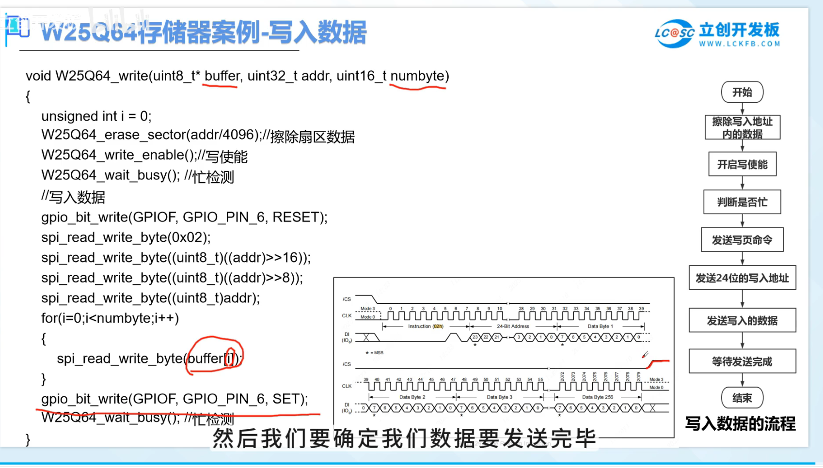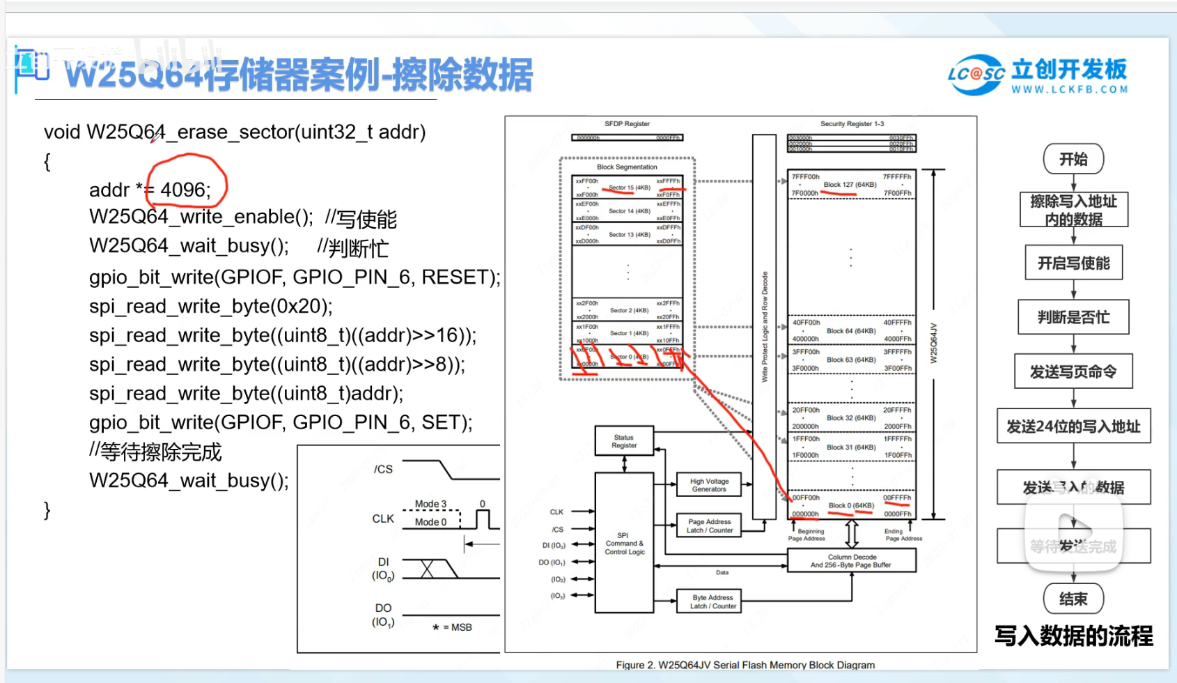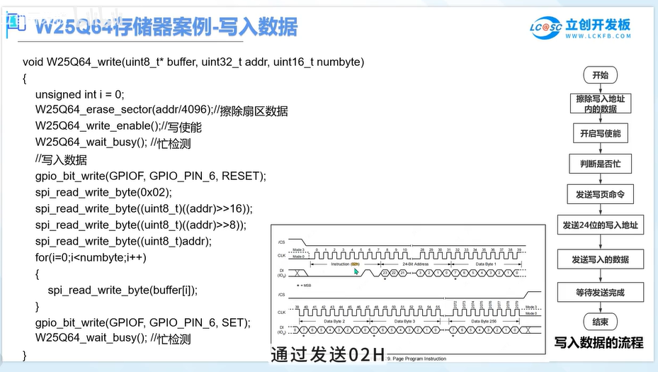 0x02) + 3字节地址 + 要写入的数据。需要等待"写忙"状态结束(通过读状态寄存器0x05)。