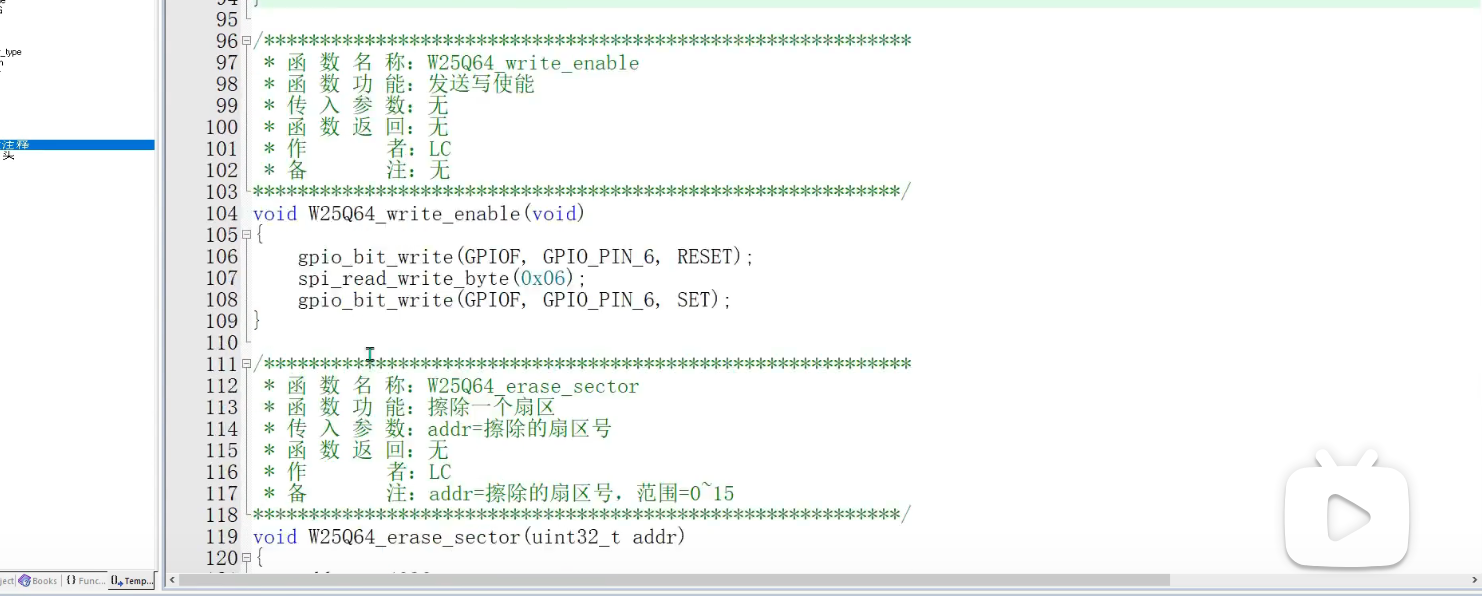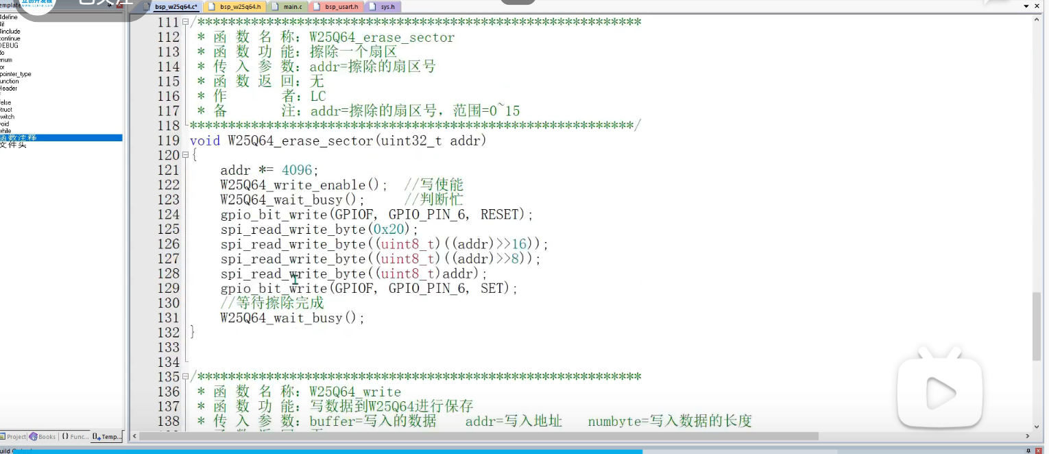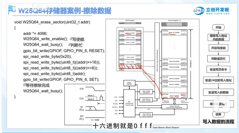 这里是擦除一个扇区,W25Q64将内存分为了0-127共128块,每个块有64KB,然后又将块分成了0-15共16个扇区,每个扇区是4KB,块0的首地址是0H,结束地址是FFFFh,转换到扇区首地址就是0000h,结束地址就是FFFFh,然后扇区内的第一个扇区结束地址就是0FFFh,第二个扇区结束地址就是1FFFh,一直到最后一个扇区FFFFh,这里实现的就是擦除一个扇区的操作,一个扇区的4K换算成16进制就是0FFFh,转换成十进制就是4096,4K扇区的意思是0X00-0XFF 内存为4096。