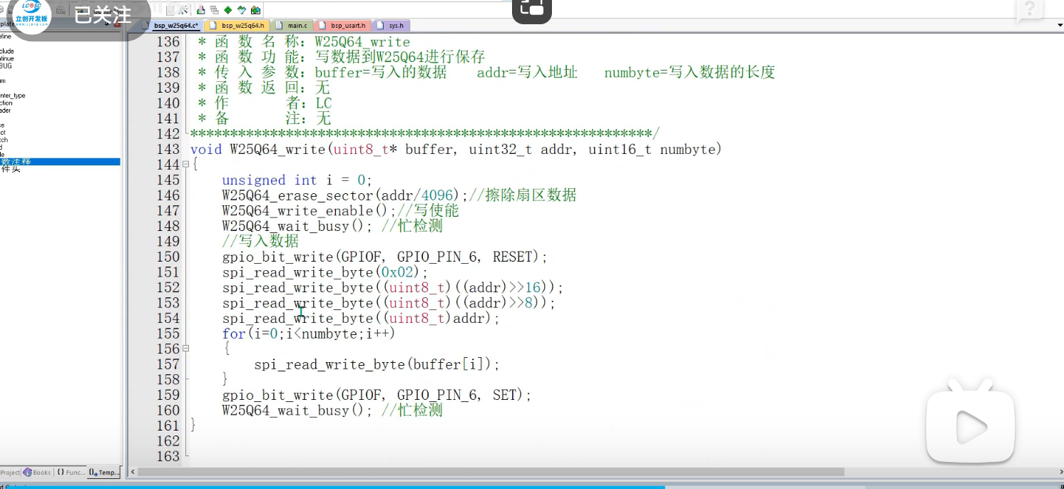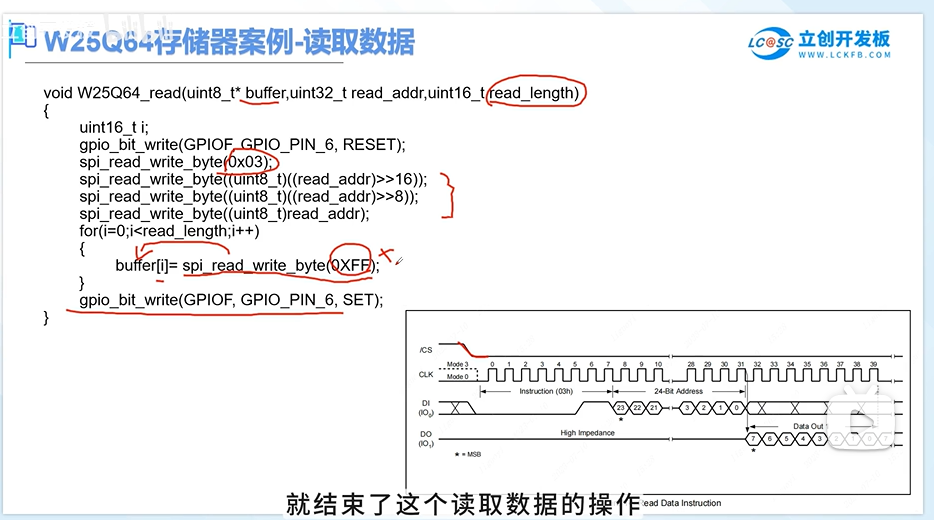 将数据读取出来测试写入的数据是否准确,读数据首先发送03H这个命令,在发送读取的地址,然后从机就会发送数据给我们,代码方面首先拉低CS,发送03H命令告诉从机我要读取数据,然后发送24位的读取地址,然后根据我们传入的读取长度去读取出数据,0XFF是假数据(是为了产生CLK),将读取的数据不断保存到传入的参数buffer里(参数会不断的自增),就实现了连续的读,读完后再将CS端拉高,就结束读取数据的操作。
