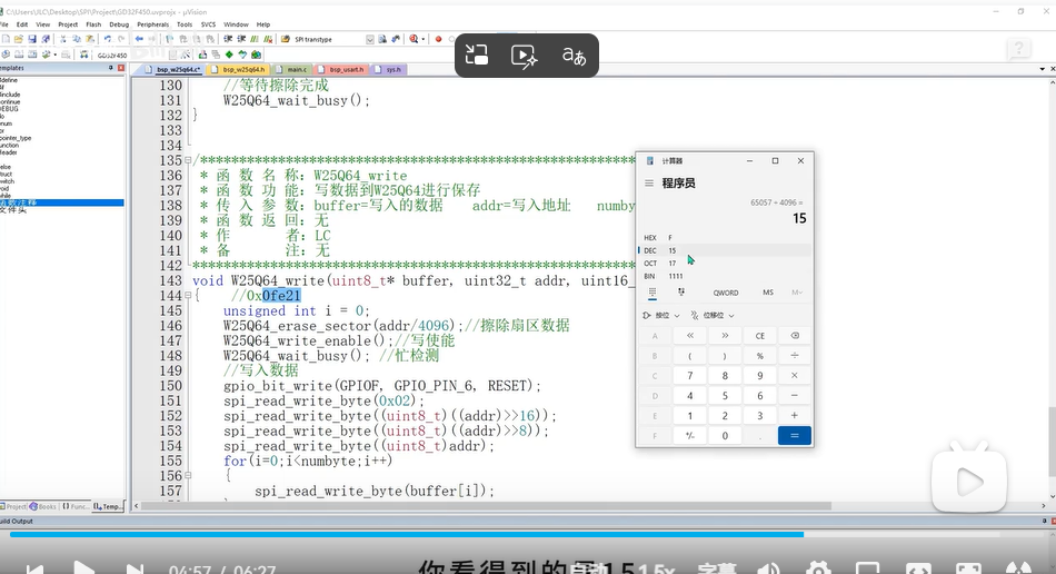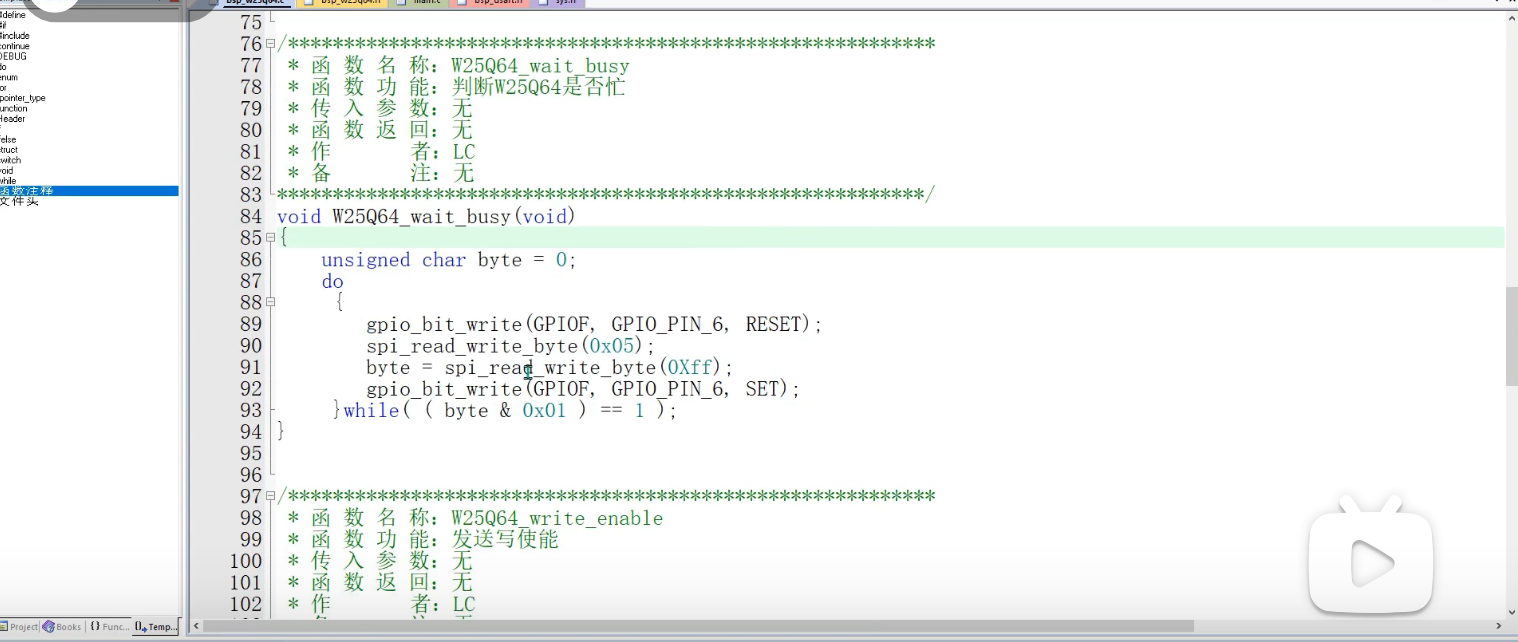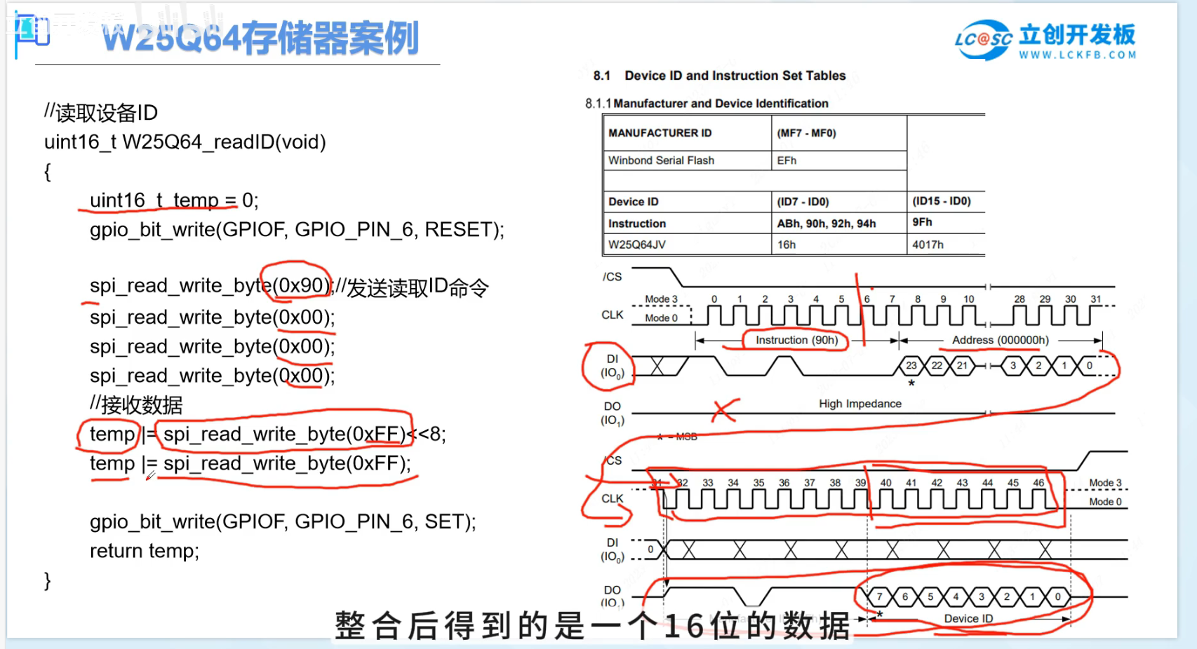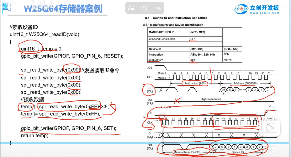 先将CS段拉低,通过发送与读写函数去发送一个字节,这样就自动启动了时钟,发送0X90是手册中查询厂商期间8位ID的命令,后面再跟着发送24个二进制0,也就是三个0X00,发送完数据后就开始准备接收数据,由于从设备的时钟是由主机控制的,所以就需要主机再去发送一个无关紧要的数据(这里是0XFF)去触发这个时钟的生成。这样我们才能够从机发送给我们的数据,其中接收的数据又分为高八位制造商ID,低八位设备ID,所以触发时钟后将读取到的数据左移八位或到十六位的数据里,在发送一段0XFF触发这个时钟,读取到设备ID再或到十六位数据的低八位里,这样就得到了高位和低位整合的16位数据了(EF16),在拉高CS片选线,就完成了一次读取设备ID的操作。