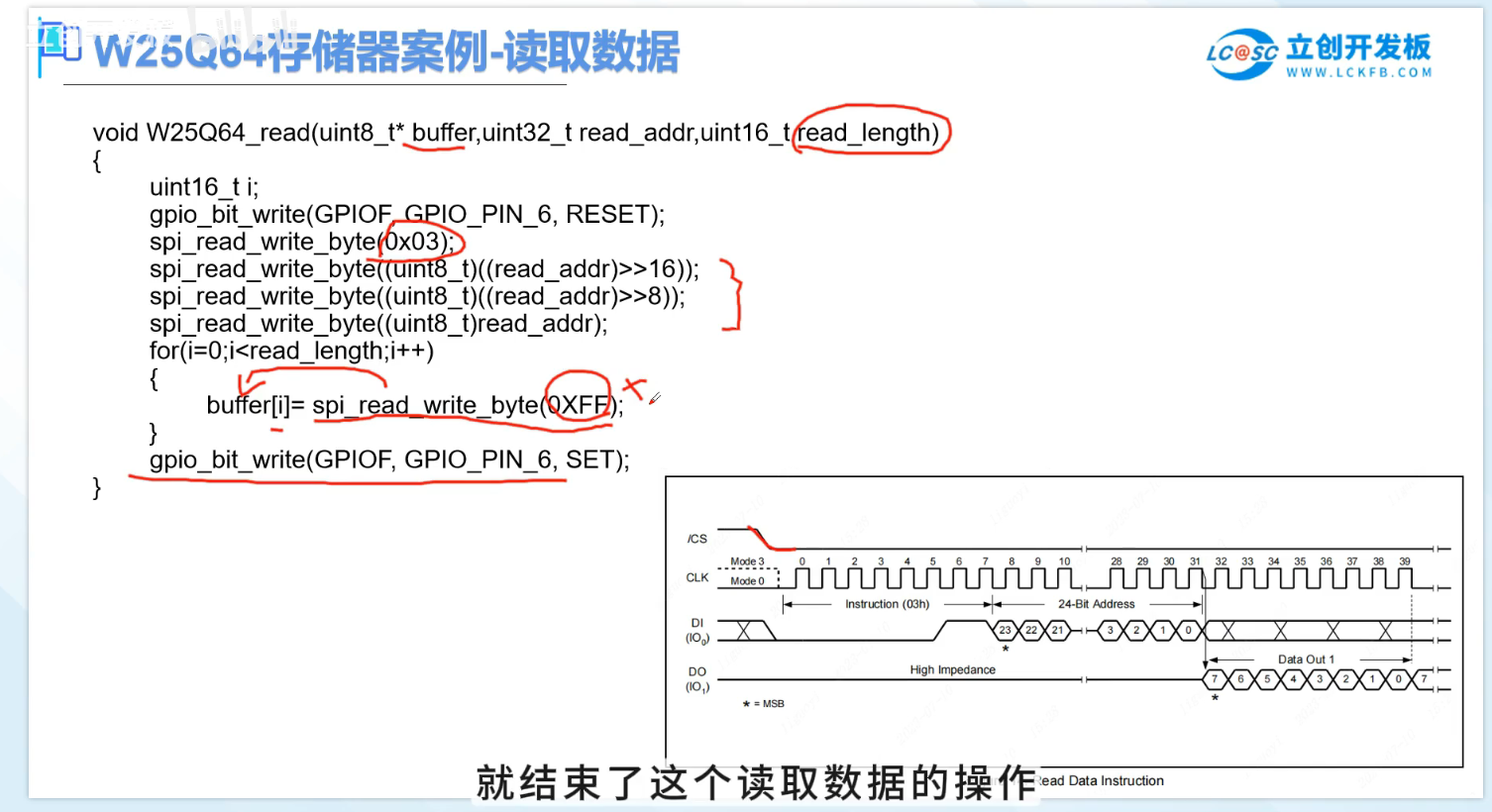 0x03) + 3字节地址 + 持续读数据。CS 在读取期间保持低电平。 -