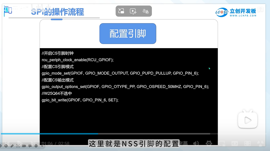 初始化: 配置 MCU 的 SPI 控制器(时钟频率、模式、数据位宽、帧格式),并将相关引脚初始化为 SPI 功能。