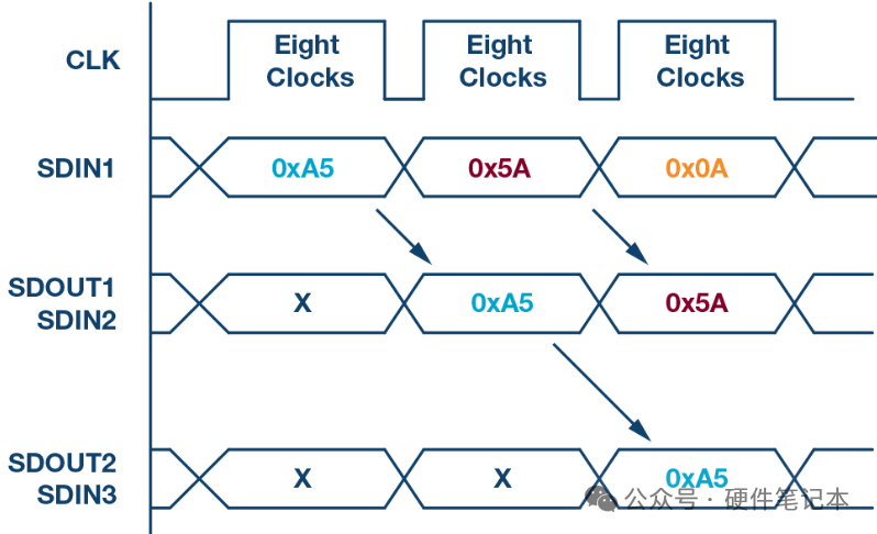 这种连接方式的特点是数据传输需要更多的时钟周期。如下图,比如在一个8位数据宽度的系统中,如果要让第三个从机收到数据,就需要24个时钟脉冲(3个从机×8位),而在常规SPI模式下只需要8个时钟脉冲。这是因为数据需要依次通过每个从机,每个从机都会对数据进行处理和转发。