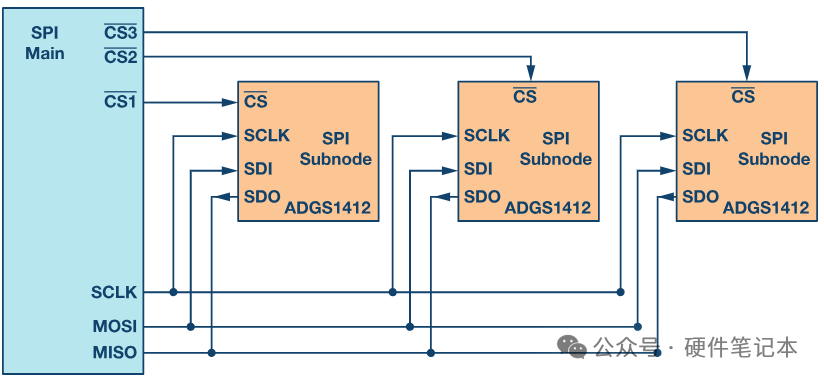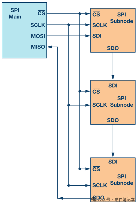 在咱们SPI常规连接模式下,咱们主机必须为每个从设备单独配备一个片选信号线(CS)。当主机将某个从机的CS信号拉低时,这个从机就被选中,此时MOSI和MISO线上的时钟和数据信号就可以和这个特定的从机进行通信。关注公众号:硬件笔记本