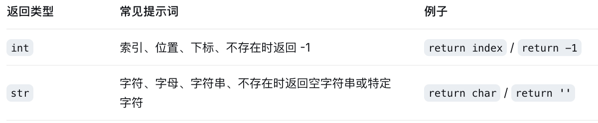 def firstUniqChar(s: str) -> int: # 这里的s是函数参数名,代表传入的整个字符串