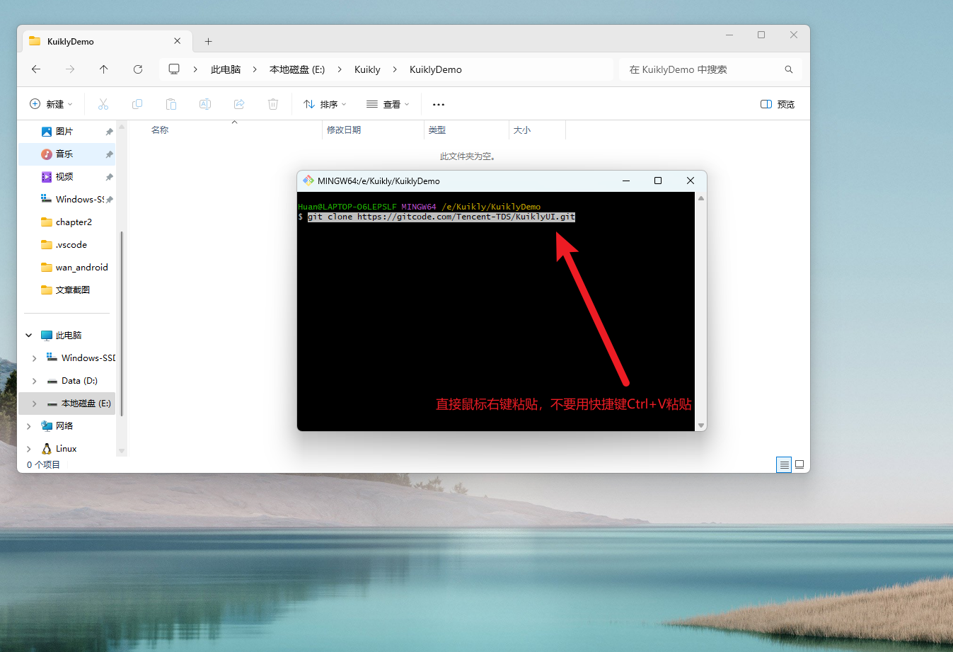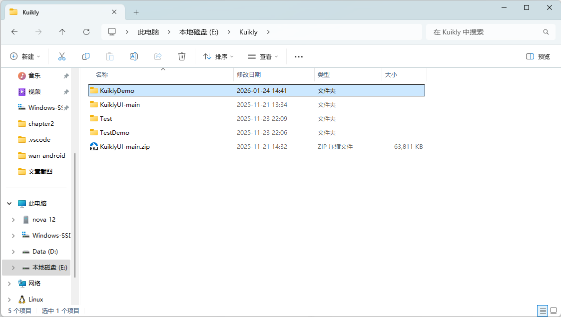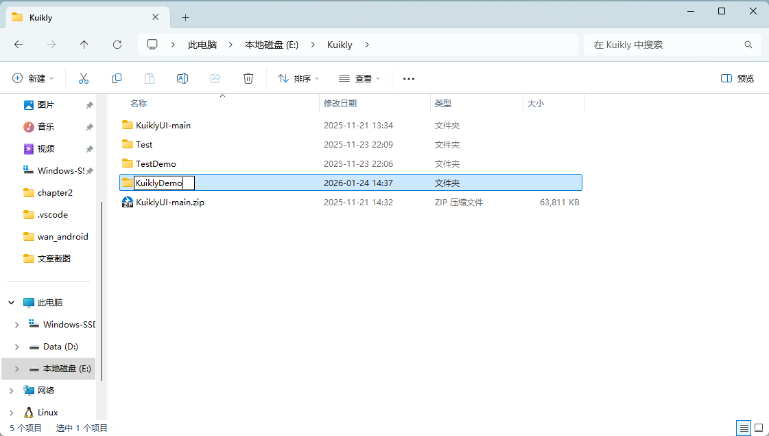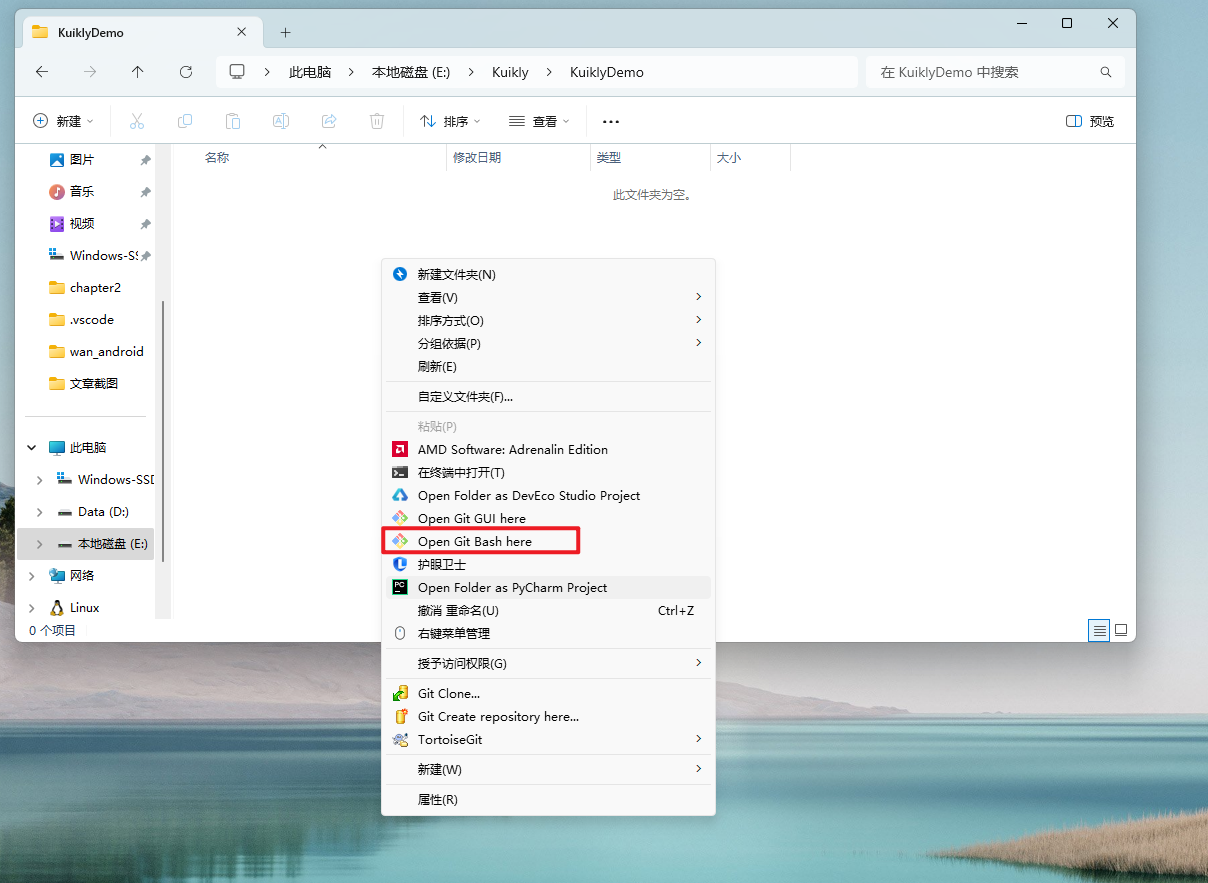 本教程采用下拉仓库,再运行脚本的方式搭建Kuikly环境。同时也推荐这种方式,相比于Android Studio搭建Kuikly的教程,这种较为简单。新建一个名为KuiklyDemo的文件夹,并且双击进入。