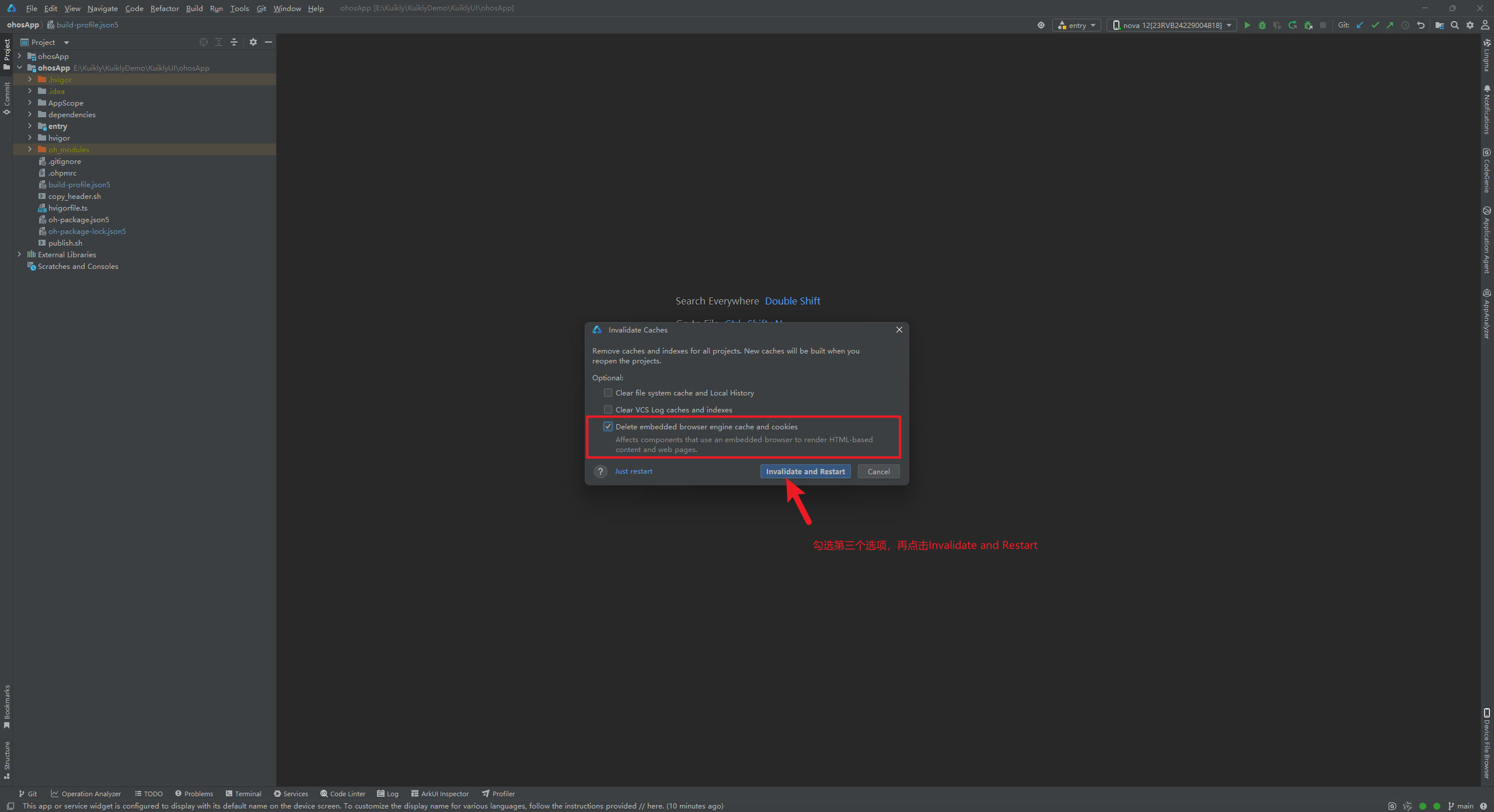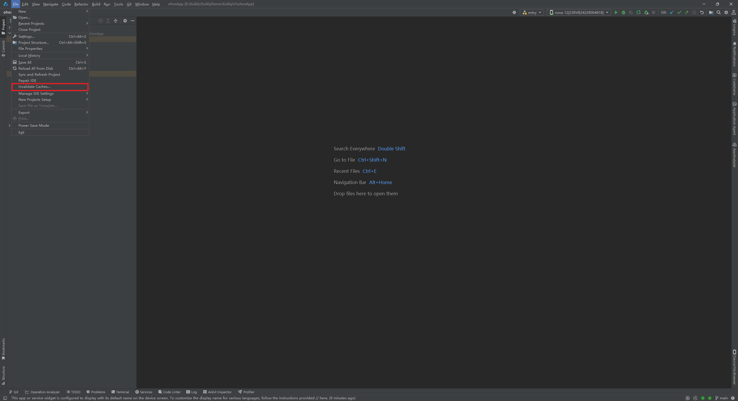 点击DevEco Studio左上角的File再选中Invalidate Caches