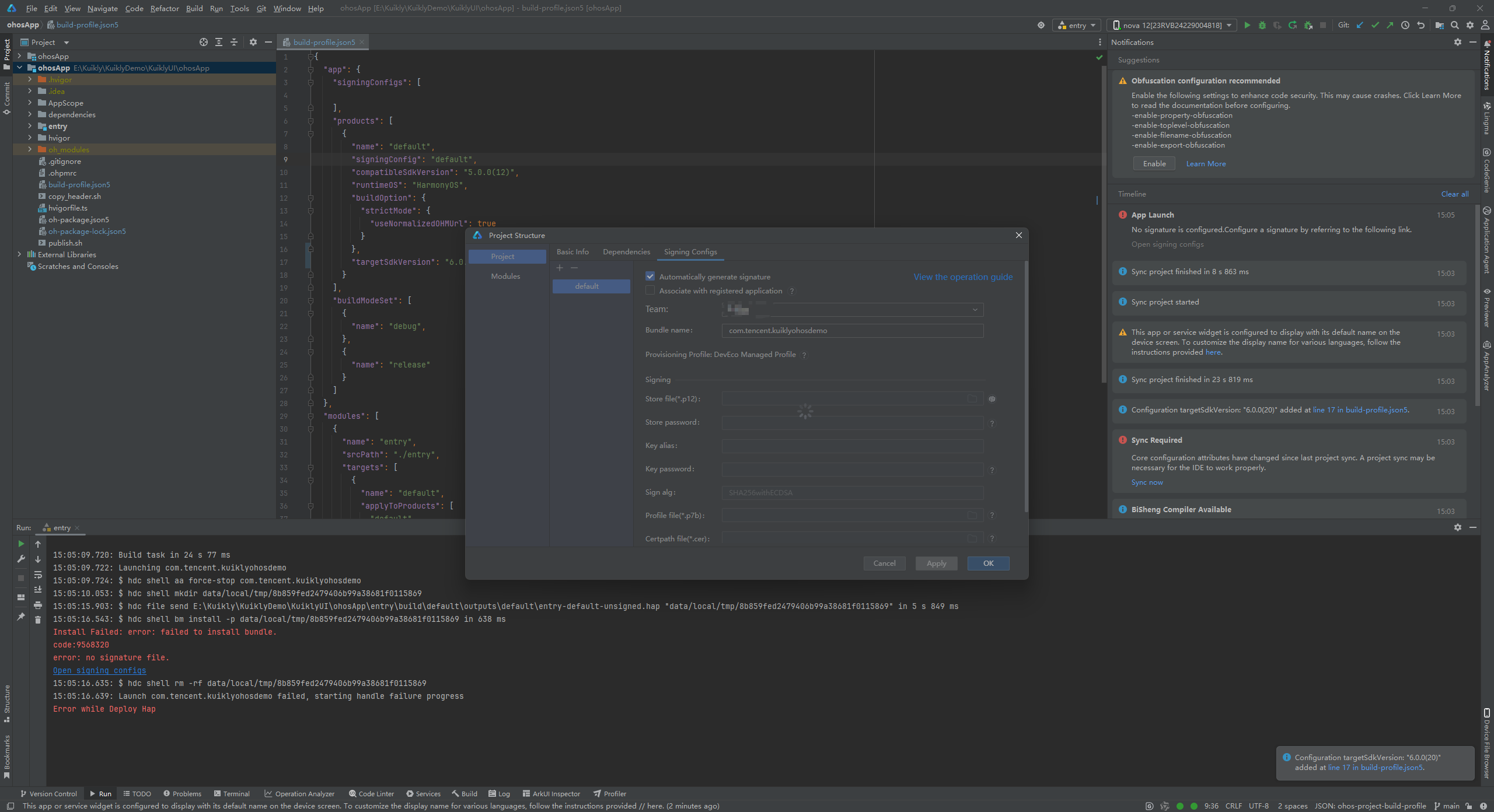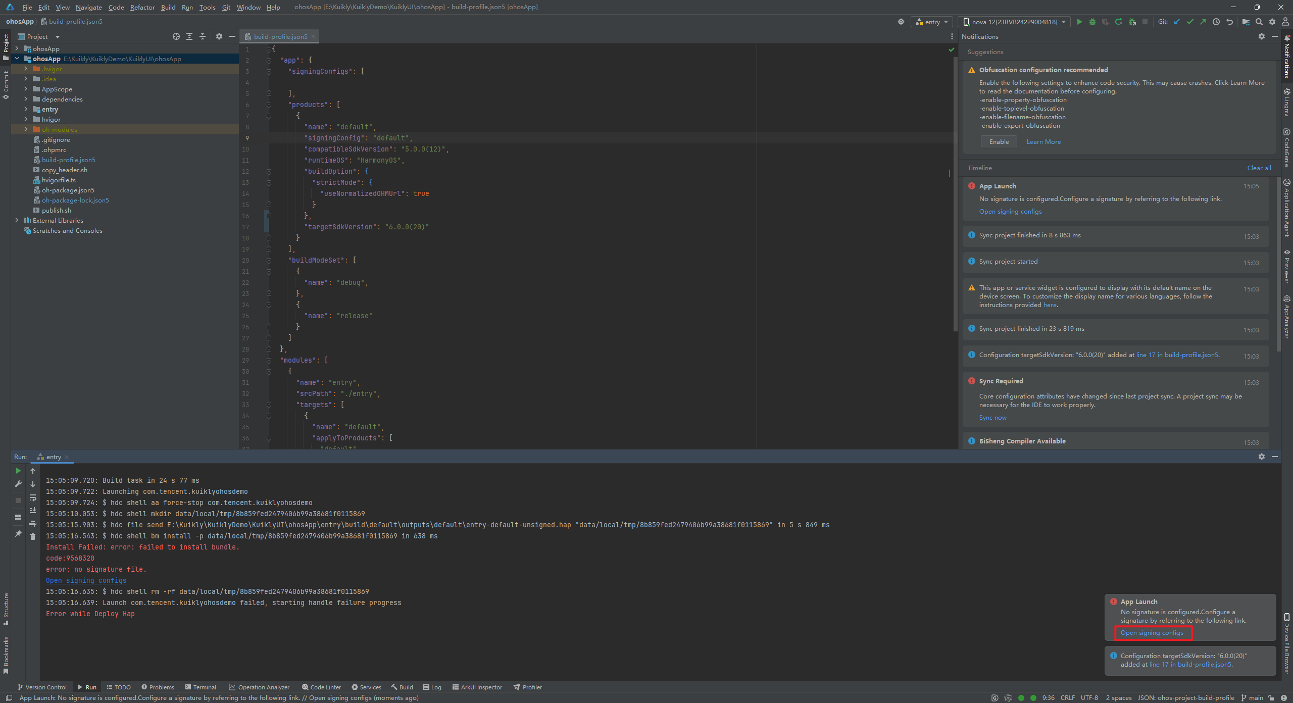 当作者执行完2.2的操作时,依然报错签名问题,怀疑是DevEco Studio抽风了。我们这个时候再重复一次2.2的操作,最后编译器就能正常运行到真机了。