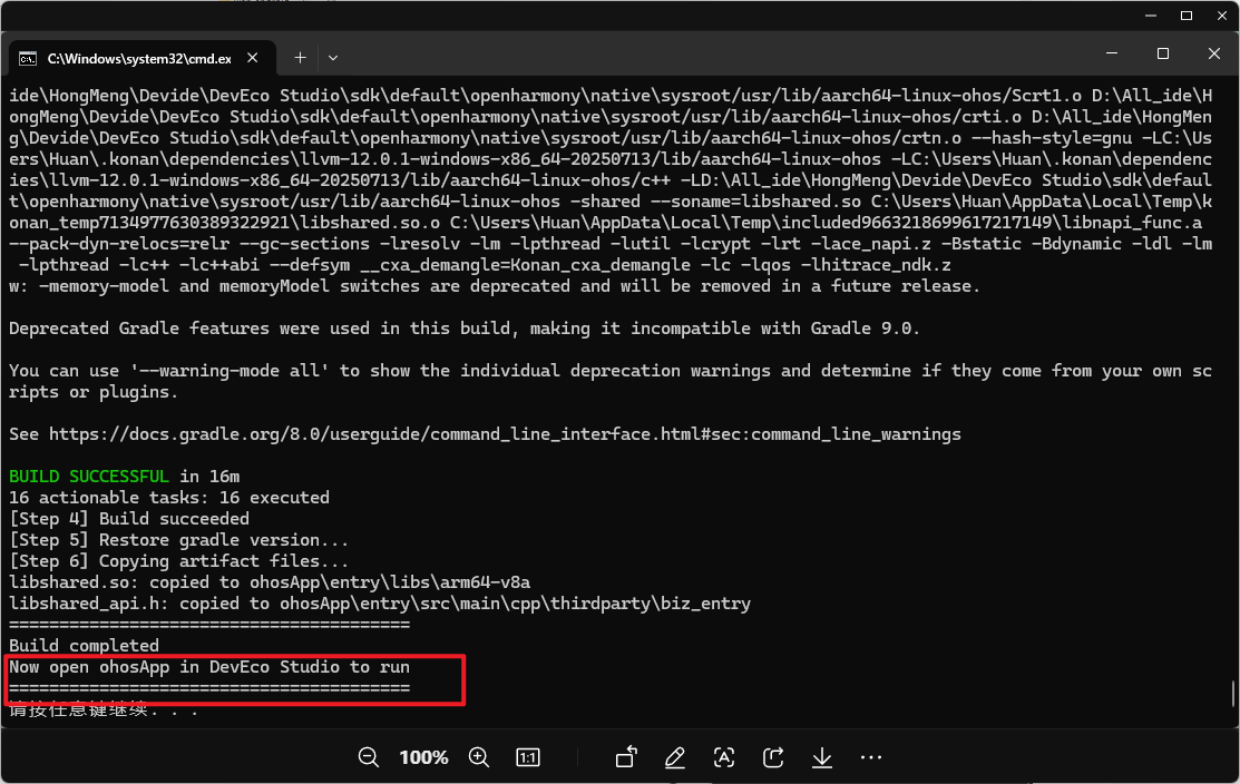 如下图,才算是编译完成。编译完成后他会给出一些信息,比如我的电脑在编译过程一共耗时16分钟,现在可以打开DevEco Studio运行ohosApp这个目录了。