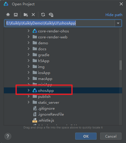 选中KuiklyUI目录中的ohosApp,点击ok即可打开,然后等待编译。