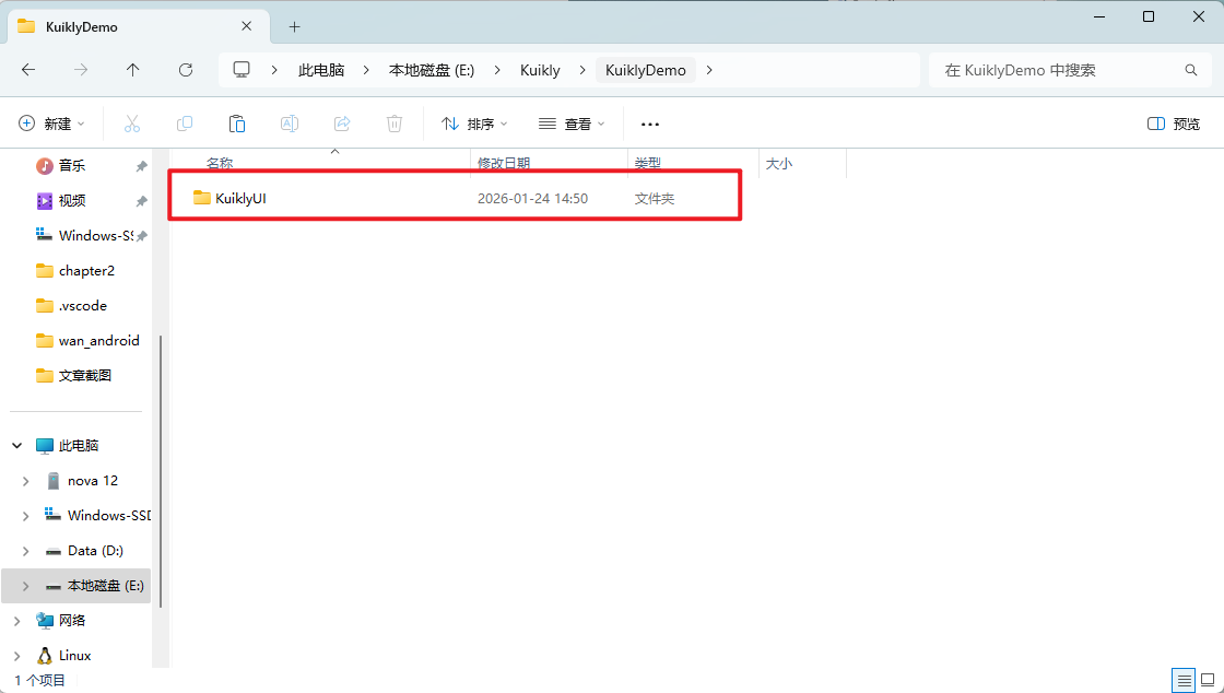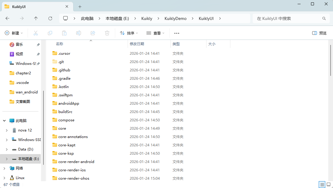 代码执行完了,我们的KuiklyDemo就会多出来一个KuiklyUI的文件夹。我们再双击进去查看文件夹里面是否有内容,如果有内容就是正常的,没有内容就是有问题的。