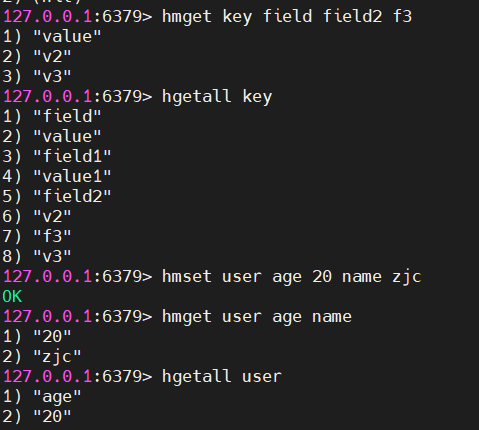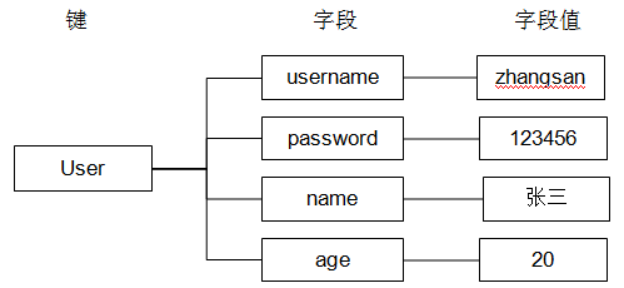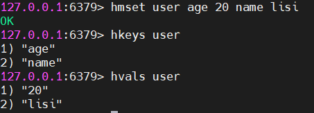 hash叫散列类型,它提供了字段和字段值的映射。字段值只能是字符串类型,不支持散列类型、集合类型等其它类型。如下: