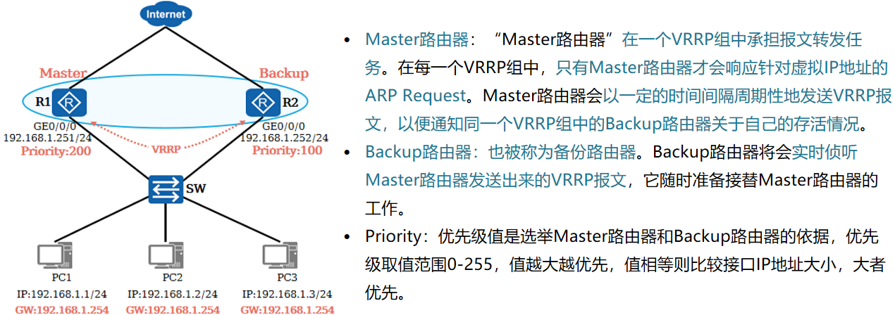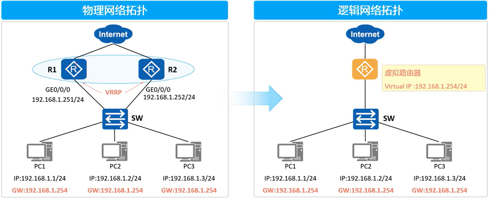 - 通过把几台路由设备联合组成一台虚拟的"路由设备",使用一定的机制保证当主机的下一跳路由设备出现故障时,及时将业务切换到备份路由设备,从而保持通讯的连续性和可靠性。