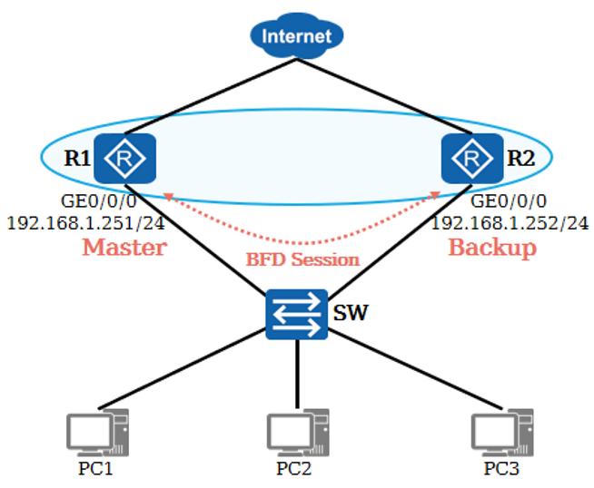 - 通过配置VRRP与BFD联动,当Backup设备通过BFD感知故障发生之后,不再等待Master_Down_Timer计时器超时而会在BFD检测周期结束后立即切换VRRP状态,此时可以实现毫秒级的主备切换。