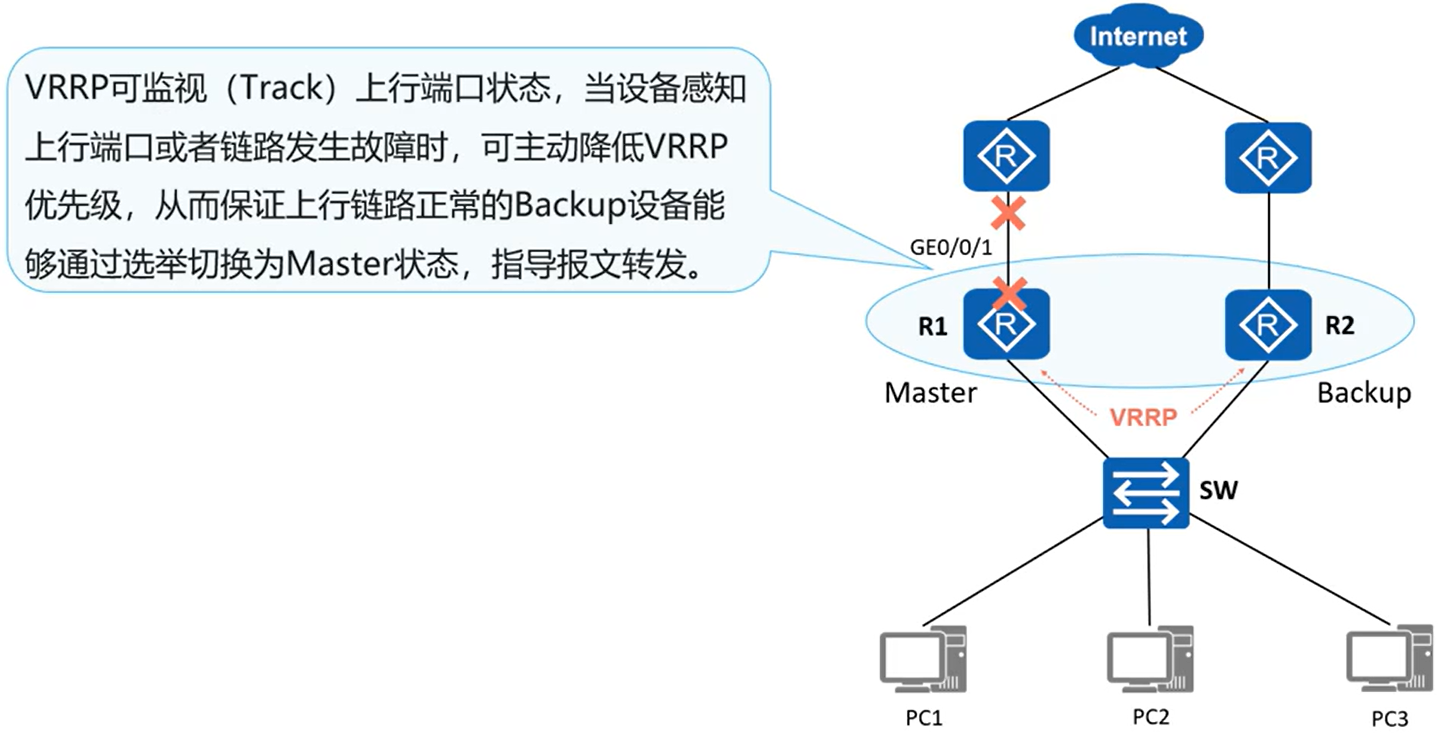 - 如果用户未配置VRRP监视上行端口,则当VRRP备份组中的Master设备R1的上行接口或者链路出现故障时,VRRP备份组无法感知,Master无法向外转发流量。但是由于主备不会发生切换,导致出现流量黑洞。