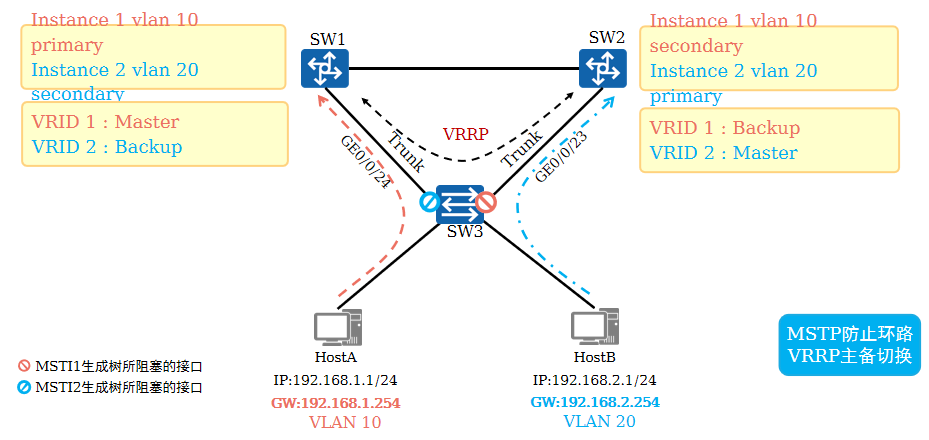 - VRRP+MSTP可以在实现负载分担的同时保证网络冗余备份。