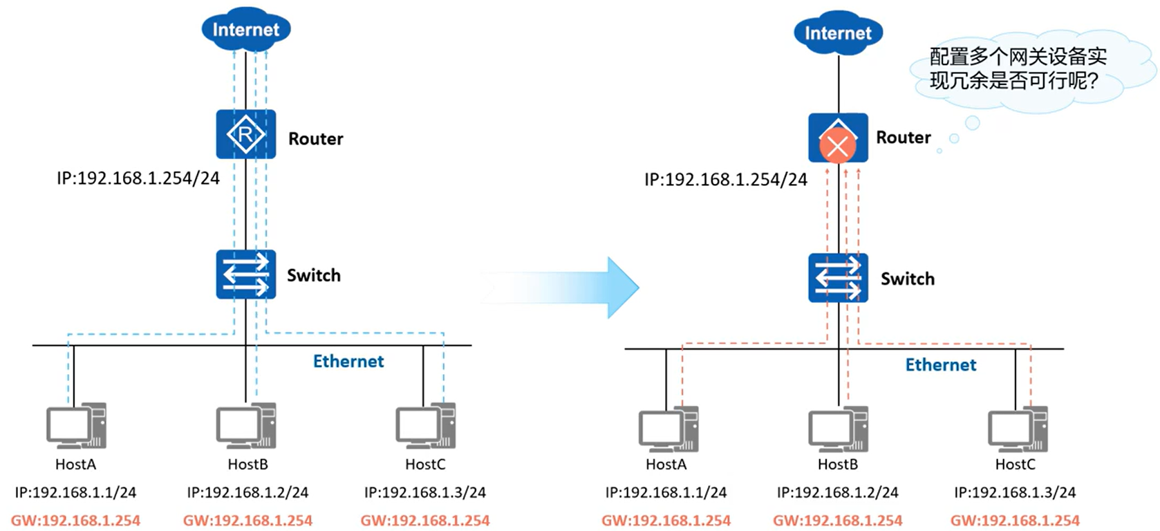 当网关Router出现故障时,本网段内以该设备为网关的主机都不能与Internet进行通信。