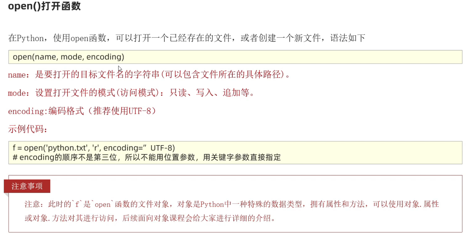 | 文件对象 = open(file, mode, encoding) | 打开文件获得文件对象 |