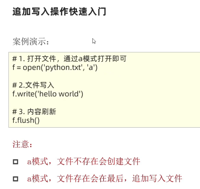 | a | 打开一个文件用于追加。如果该文件已存在,新的内容将会被写入到已有内容之后。如果该文件不存在,创建新文件进行写入。 |