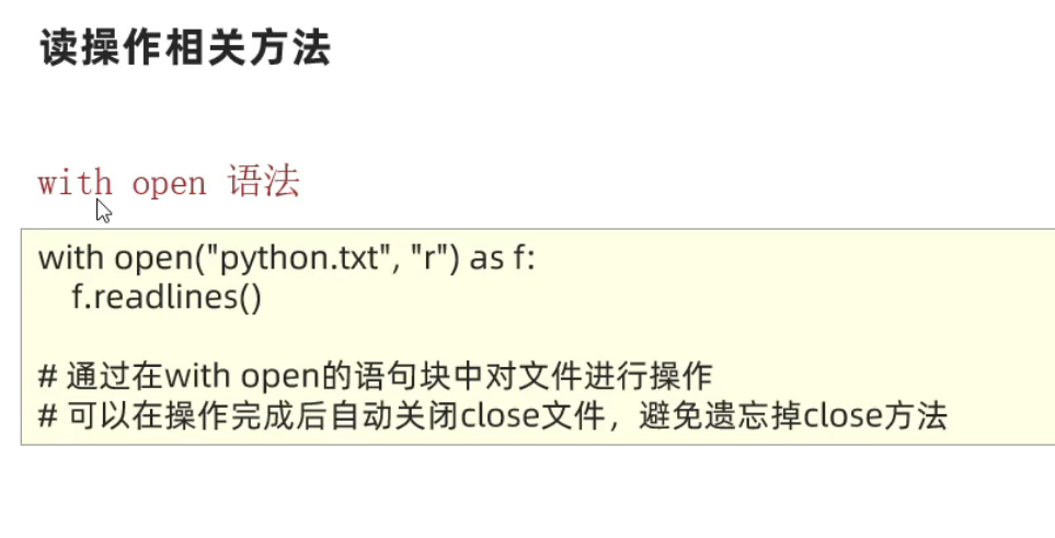 | with open() as f | 通过with open语法打开文件,可以自动关闭 |