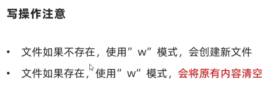 | w | 打开一个文件只用于写入。如果该文件已存在则打开文件,并从开头开始编辑,原有内容会被删除。如果该文件不存在,创建新文件。 |