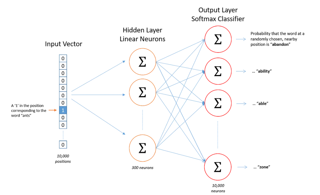 而对于所有单词的神经元参数表示之和,我们称之为嵌入矩阵,则在本场景中嵌入矩阵的规模就是10000×300。当我们想要直到某个单词在计算机中的表示(编码)是什么的时候,我们只需要查询嵌入矩阵表即可。