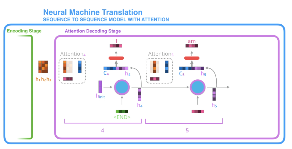 现在让我们将所有内容整合到下面的可视化图中,看看注意力过程是如何运作的:Encoding Stage:
