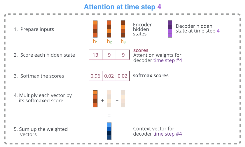 - 将每个隐藏状态乘以其softmax得分,从而放大得分高的隐藏状态 ,并掩盖得分低的隐藏状态。